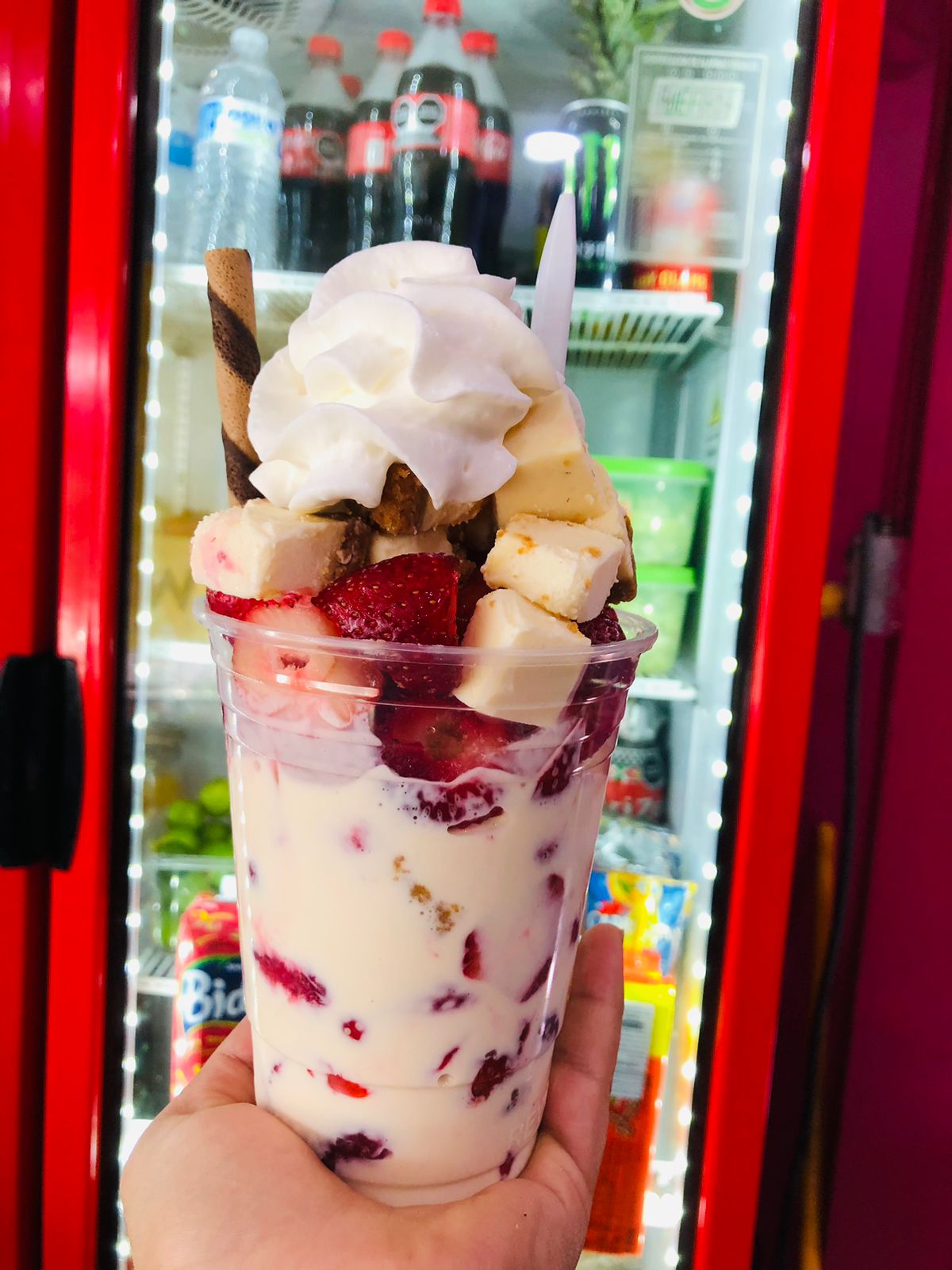 Nieve de mango natural, preparada con chamoy especial, chacatrozo, tarugo, serpentina una paleta de mango y un pulparindo