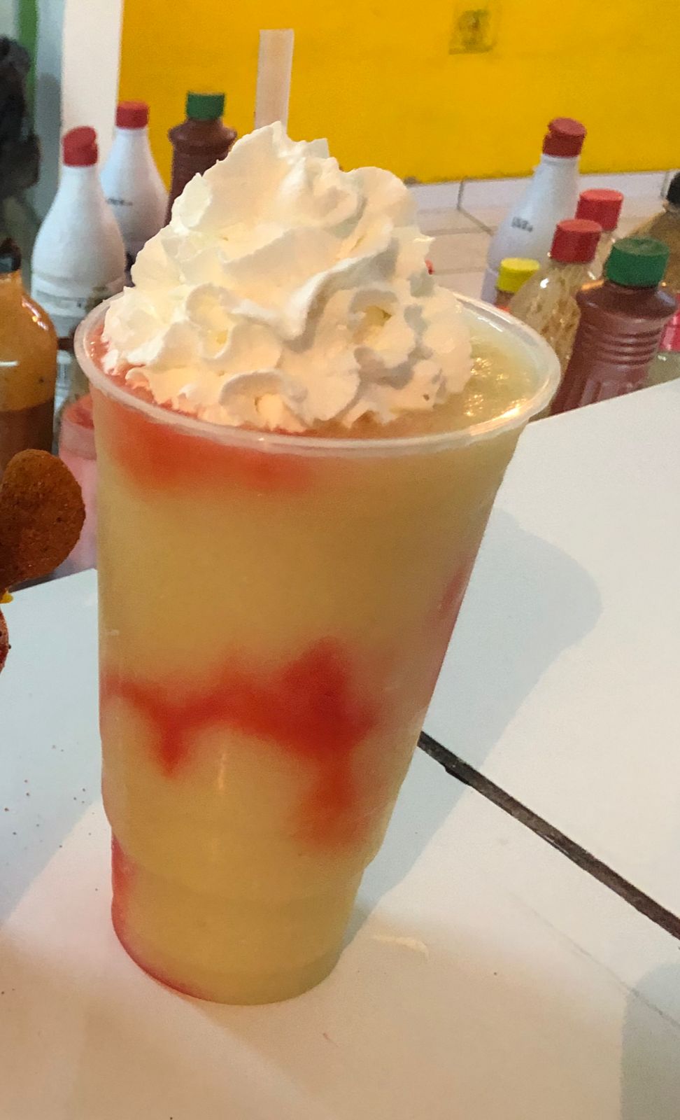Nieve de fresa natural, preparada con chamoy especial, chacatrozo, tarugo, serpentina una paleta de mango y un pulparindo