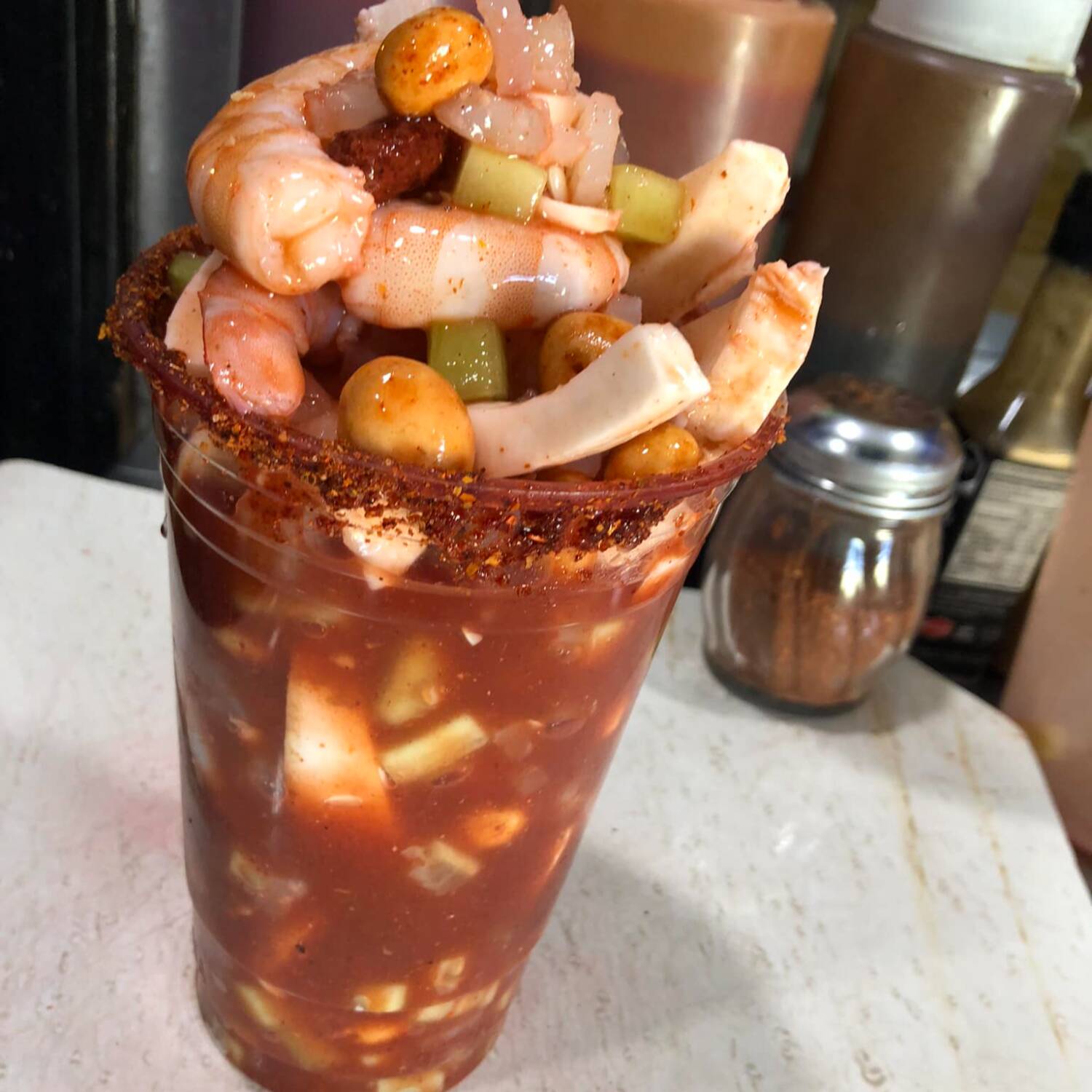 2 Sabritas a elegir, pepino, cuerito, cacahuate, chacachaca, tarugo, serpentina, camarón cocido, clamato y sus respectivas salsas marisqueras.
