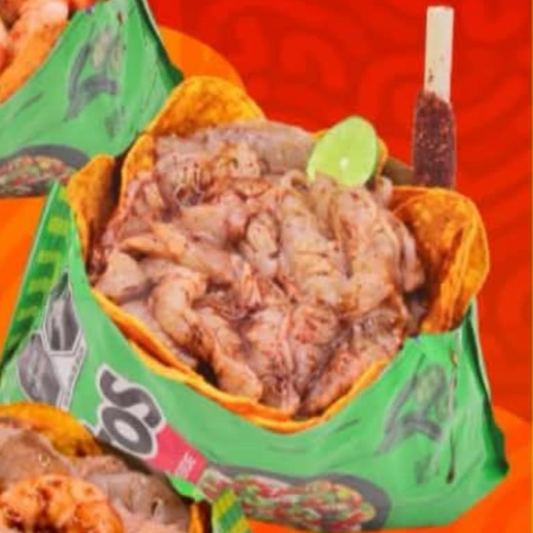 Tostitos grandes, preparados con pepino, cuerito, cacahuate, chacachaca, tarugo, serpentina, saladito y clamato preparado