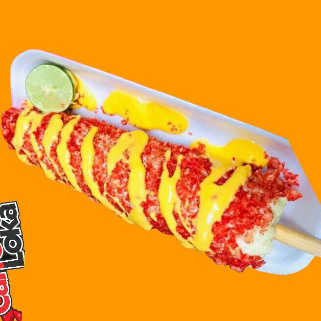 Elote entero, con mantequilla mayonesa, bañado en flamin y queso para nachos.