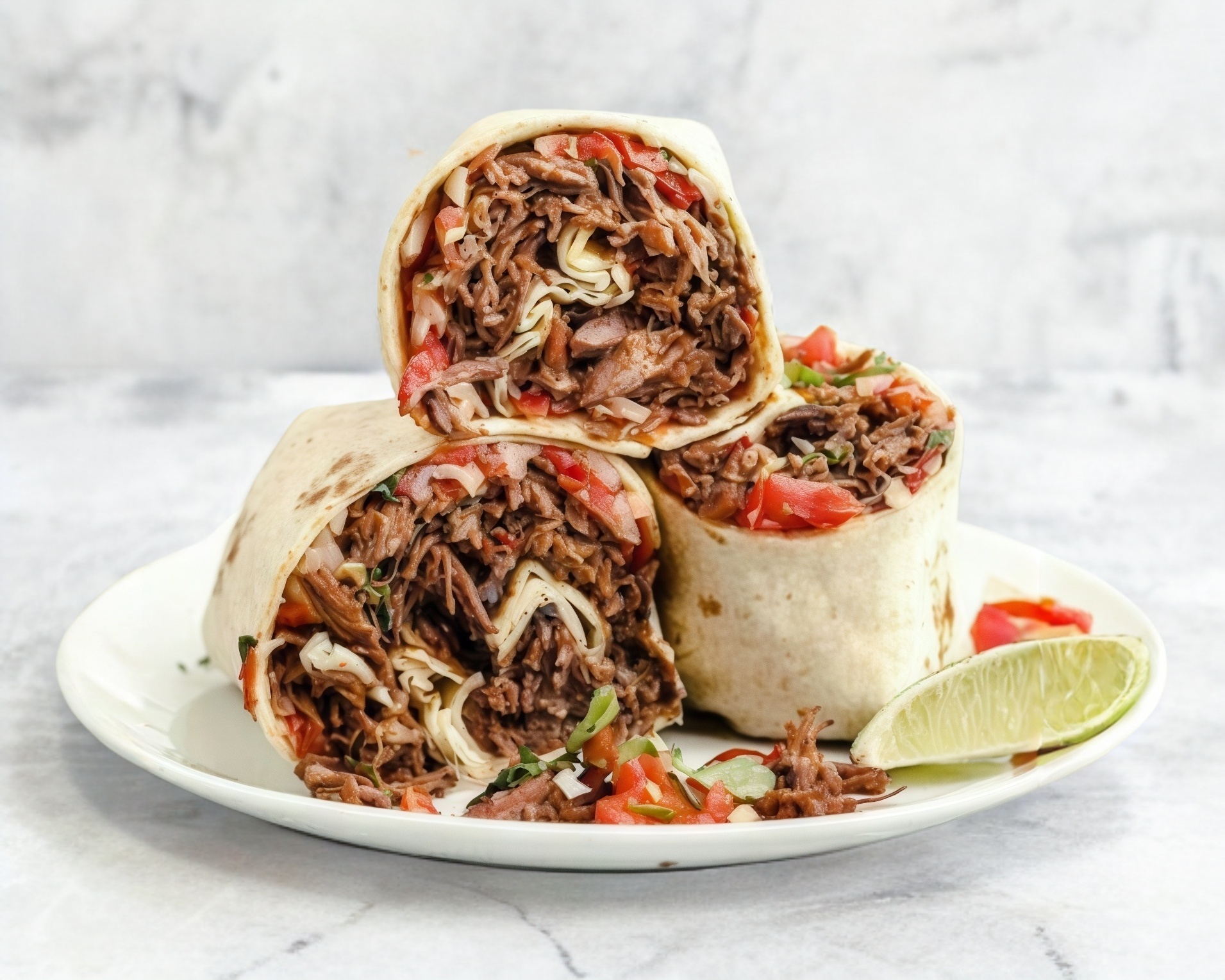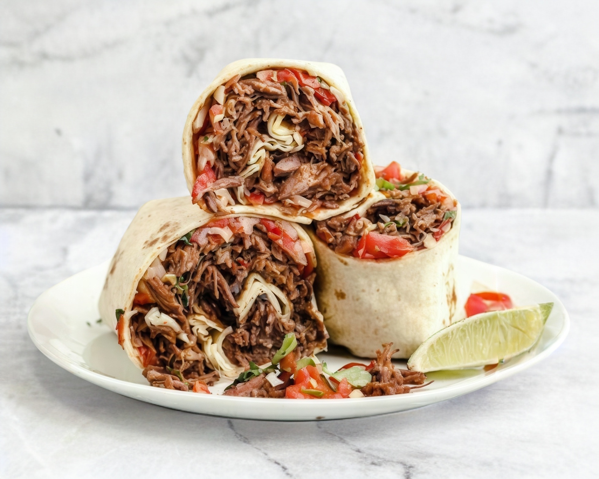 chicharron de loja cocido con salsa de tomate y chile en vuelta e tortilla de harina semidorada.