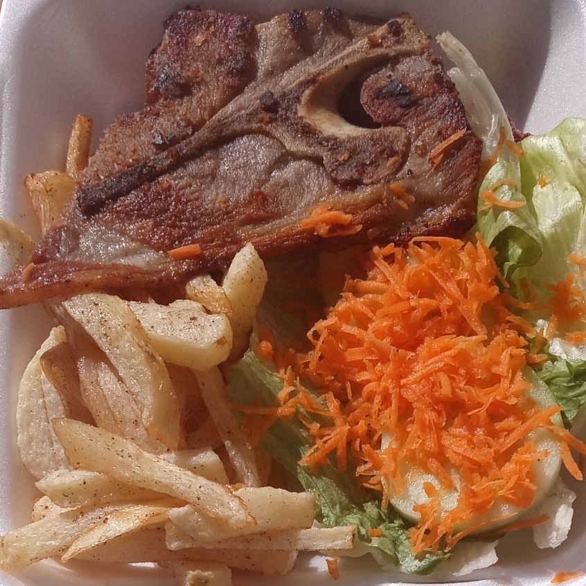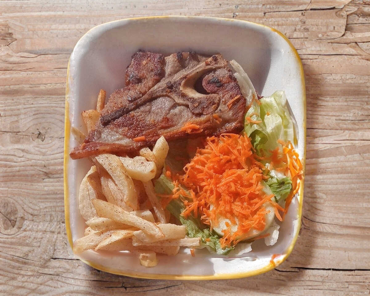 dos chuletas asadas a la plancha con especies,guarnicion papas fritas y ensalada de la casa, 4 tortillas de maiz o 3 de harina.