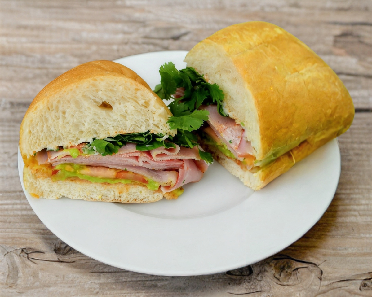 pan telera a la plancha con mantequilla,jamon a la plancha con queso chedar, lechuga,tomate,cebolla,aguacate,chile en vinagre.