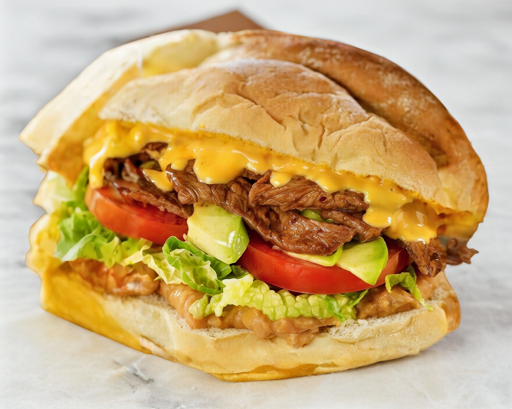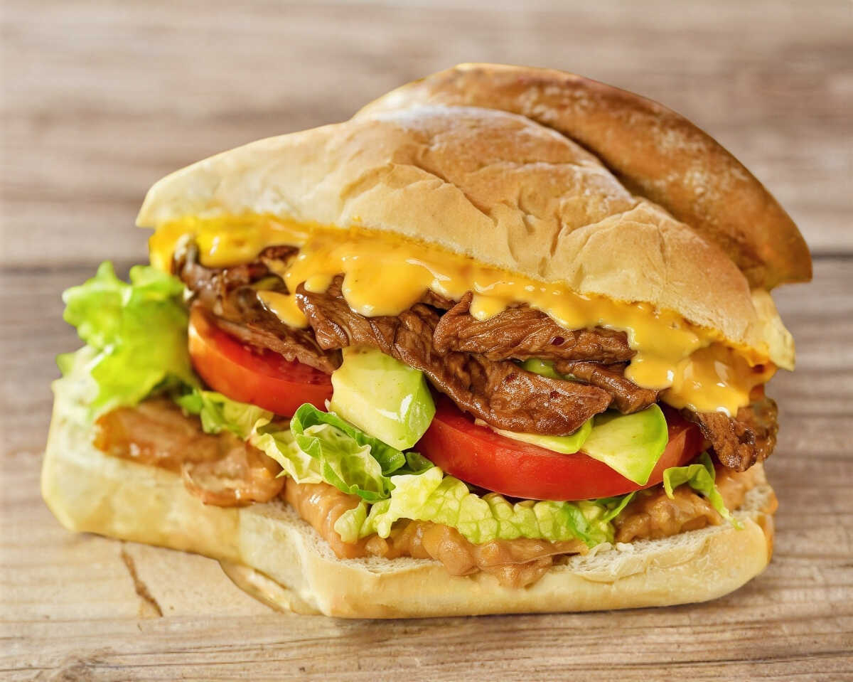 Bistec a la plancha,buba a la plancha en tiras,queso amarillo,tomate,cebolla,lechuga,aguacate,pan de torta con mantequilla y mayonesa