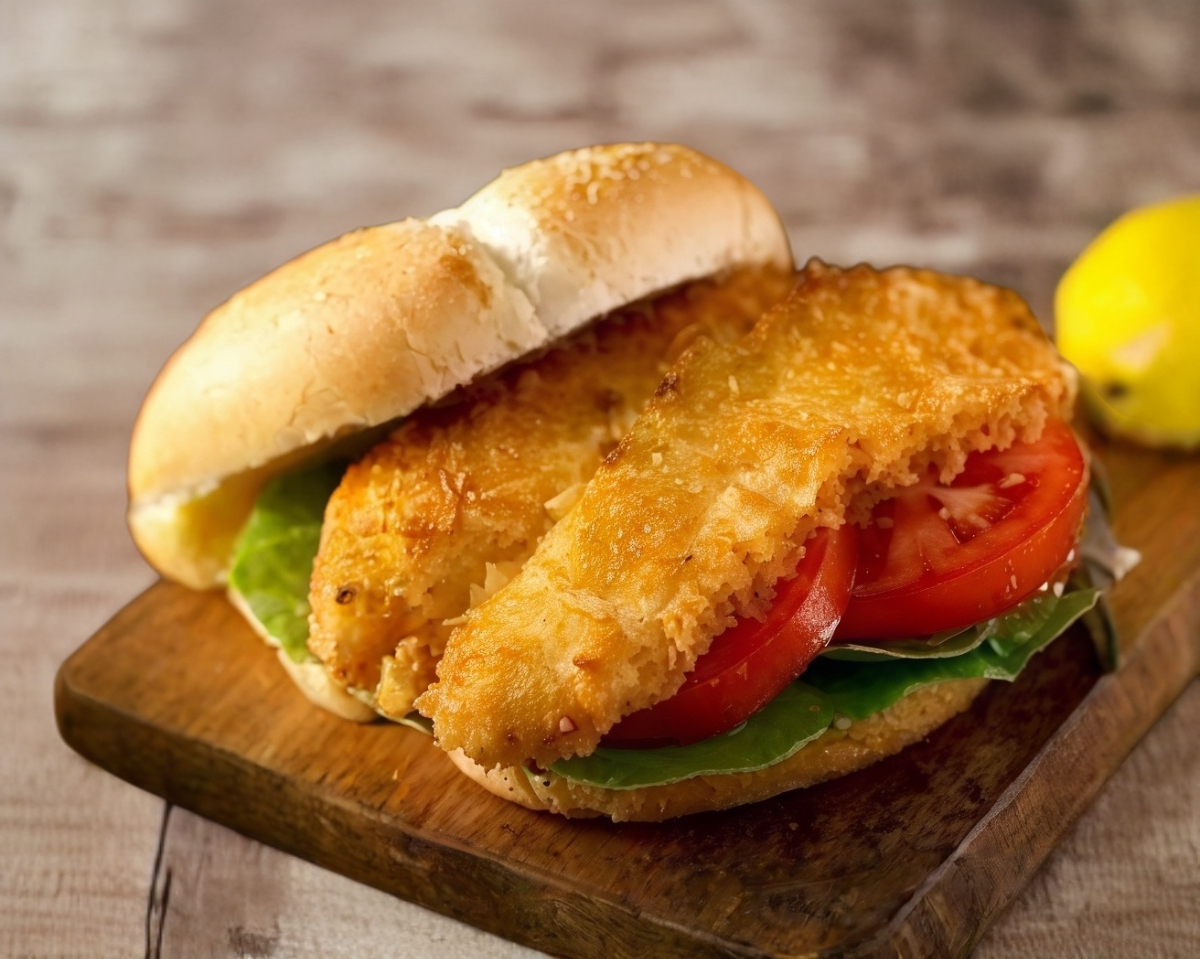 FILETE DE PESCADO SAZONADO Y EMPANIZADO FRITO EN PAN DE HAMBURGUESA,LECHUGA,TOMATE,CEBOLLA,AGUACATE,CATSUP,MOSTAZA,MAYONEZA Y CHILES JALAPENOS.