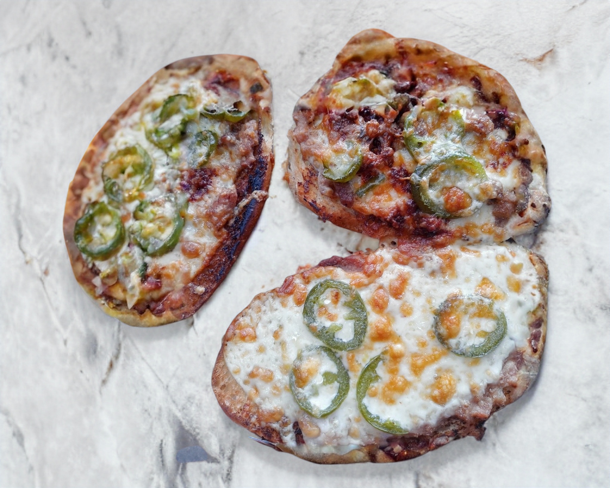 dos panes a la plancha con mantequilla horneados con frijol refrito,queso y rodajas de chile jalapeños