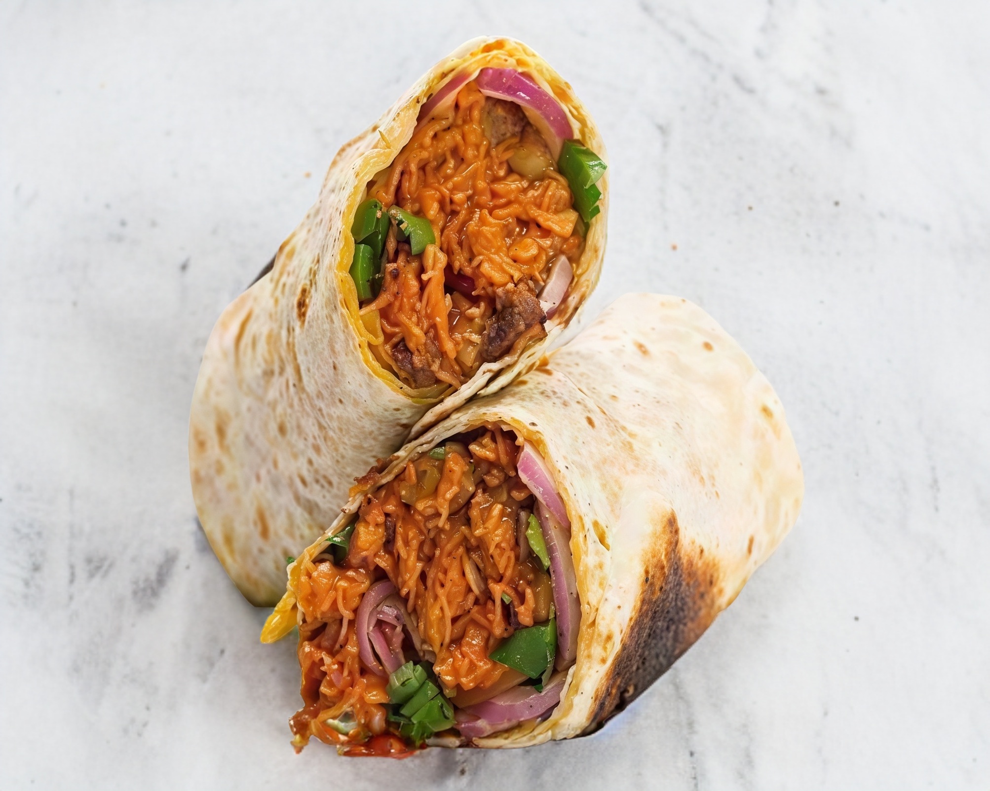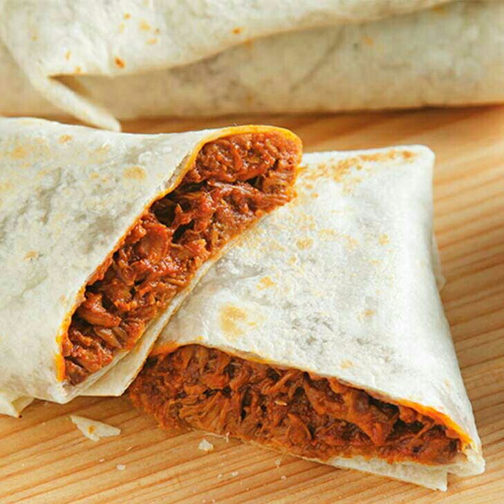 pierna de puerco deshebrada,adobo chile colorado con especies y envuelta en tortilla de harina semidorada a la plancha