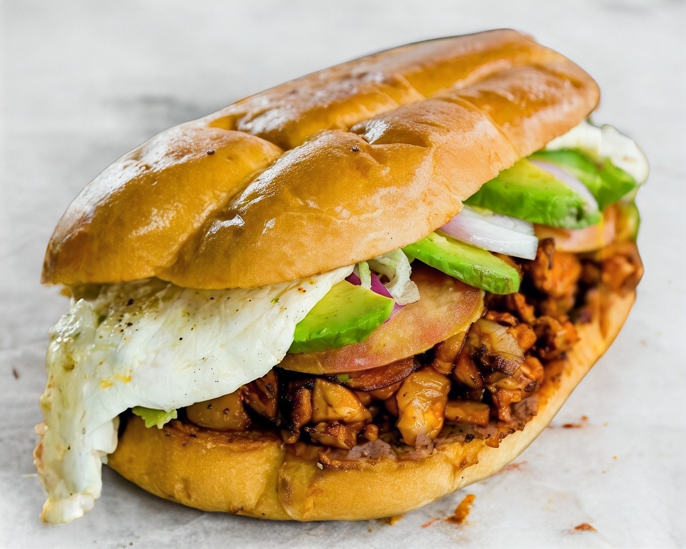 Pan de torta relleno de chicharrón y aguacate, bañada en salsa pico de gallo jugosa