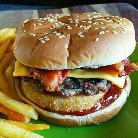 Carne de burguer,buba rebanada a la plancha,queso amarillo, verdura,aderezos