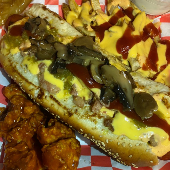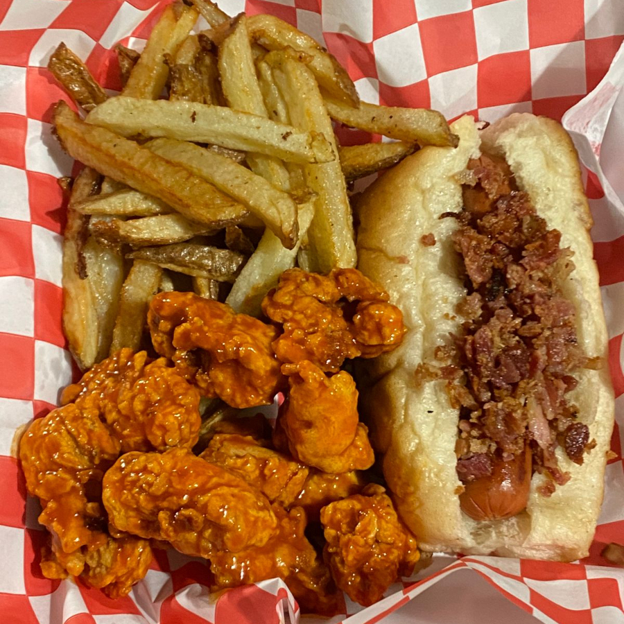 Hot dog de buba picosa con papas y 130 gr de boneless
