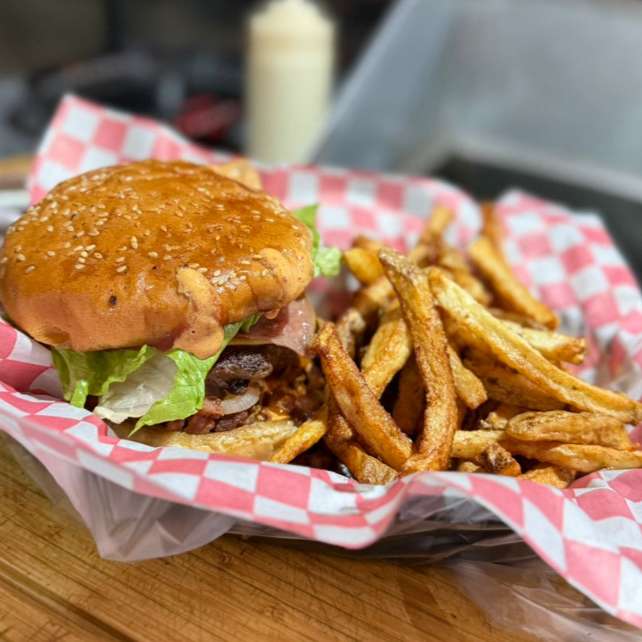 HAMBURGUESA CON CARE DE RES ACOMPANA CON UNA CAMA DE TOCINO Y OTRA CAMA DE RODAJAS DE NUESTRA FAMOSA BUBA PICANTE Y PAPAS