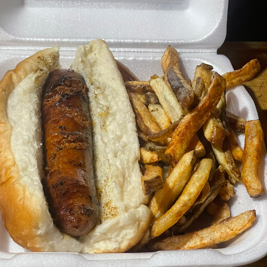Salchica Longmont, pan de panaderia, acompañado de papas fritas naturales