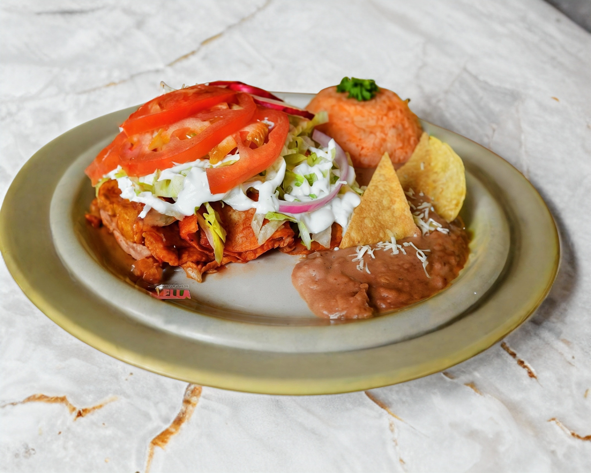 3 Enchiladas de mole de res, pollo o queso con arroz, frijol y agua de jamaica.