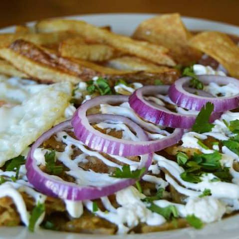 Chilaquiles, rojos o verdes sencillos o con 2 huevos estrellados o revueltos acompañados de 2 guarniciones.