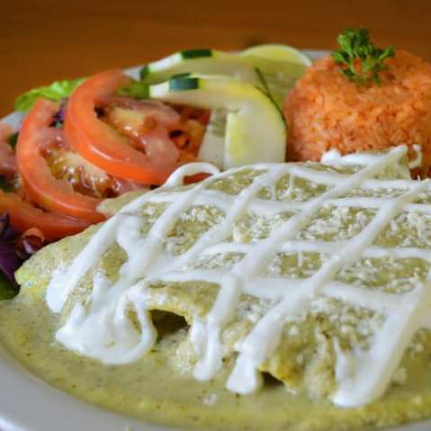 Enchiladas suizas de pollo acompañadas de 2 guarniciones, arroz, frijol, ensalada verde o ensalada de nopal y agua de jamaica.
