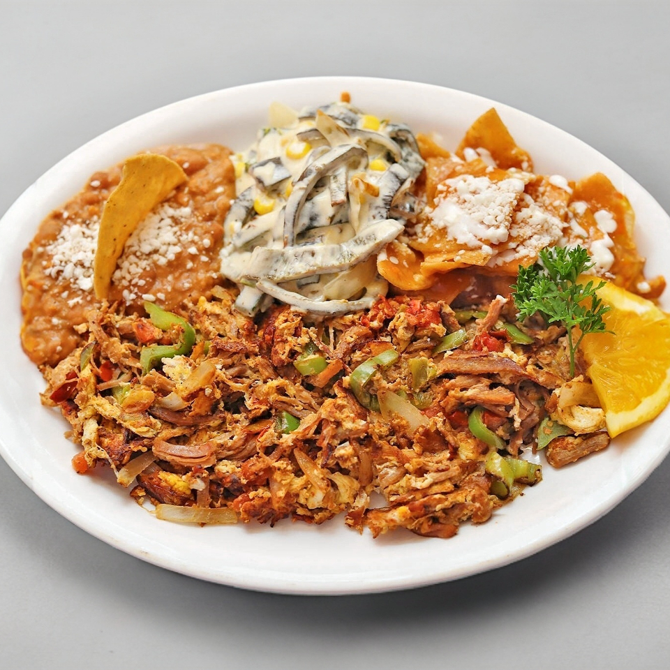 Carne con verduras acompañada de rajas con crema, chilaquiles rojos o verdes y frijoles.