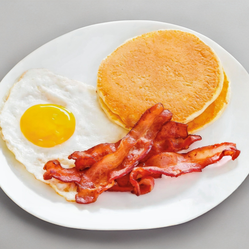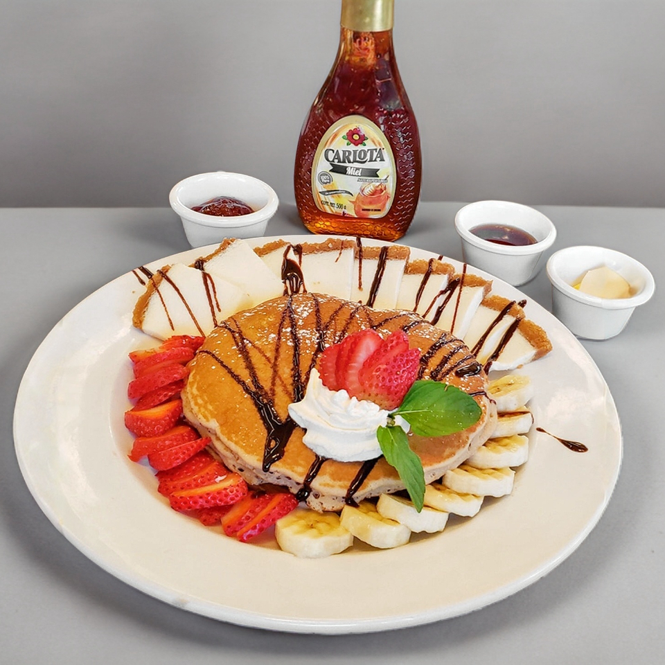 3 Hotcakes con pedacitos de plátano y fresa, acompañados con rebanadas de cheesecake