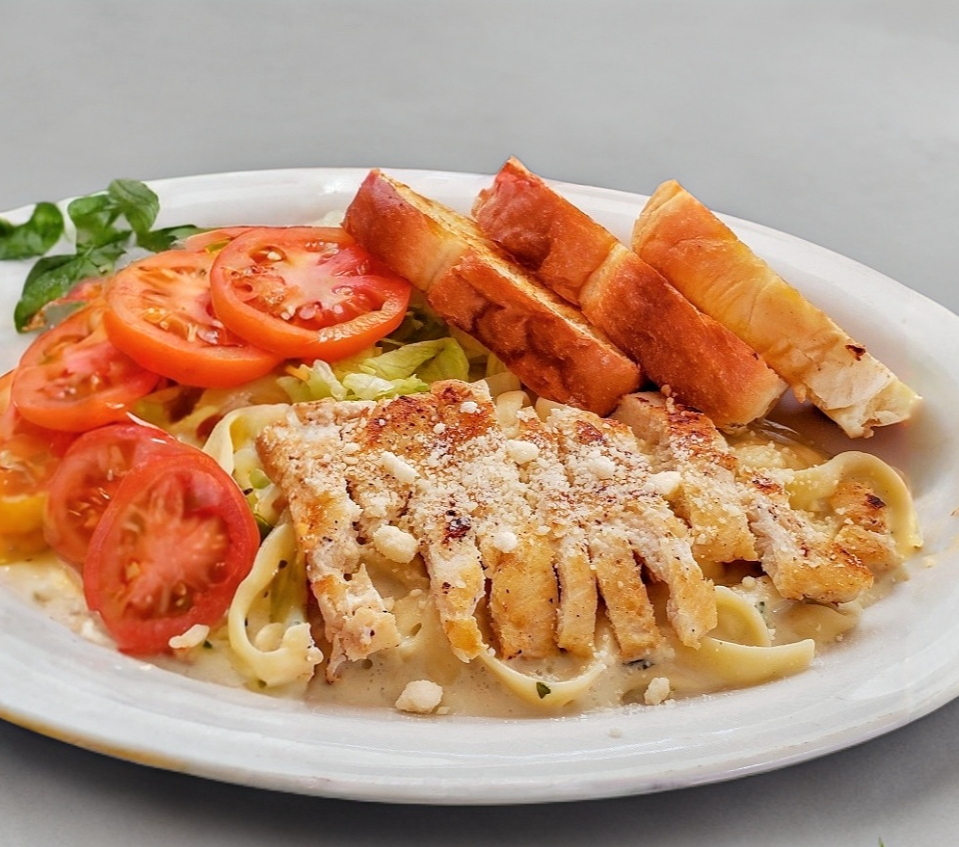 Cama de pasta acompañada de deliciosa pechuga de pollo, ensalada y pan con mantequilla