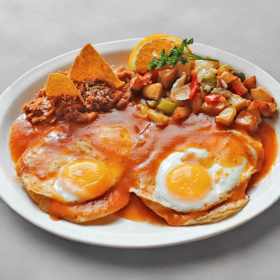 Torta de huevo con salsa especial, acompañada de una canaste de guacamole de la casa, enchiladas con queso y frijoles fritos