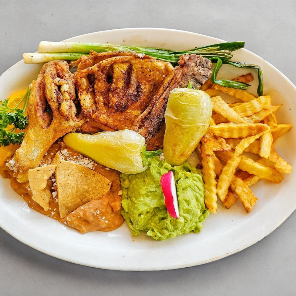 Pierna de pollo frito acompañada de guacamoles, papas fritas, cebollitas y frijoles