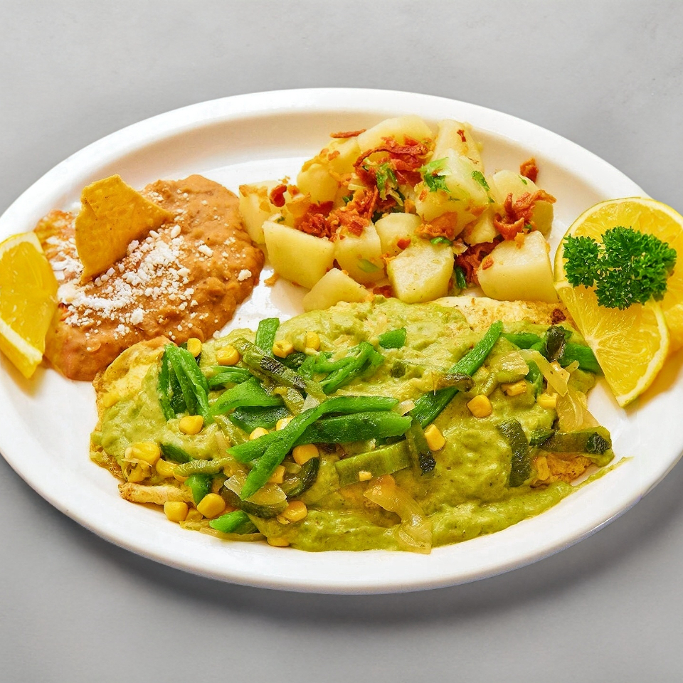 Torta de huevo bañada en salsa poblana, acompañada de papa campesina y frijoles fritos