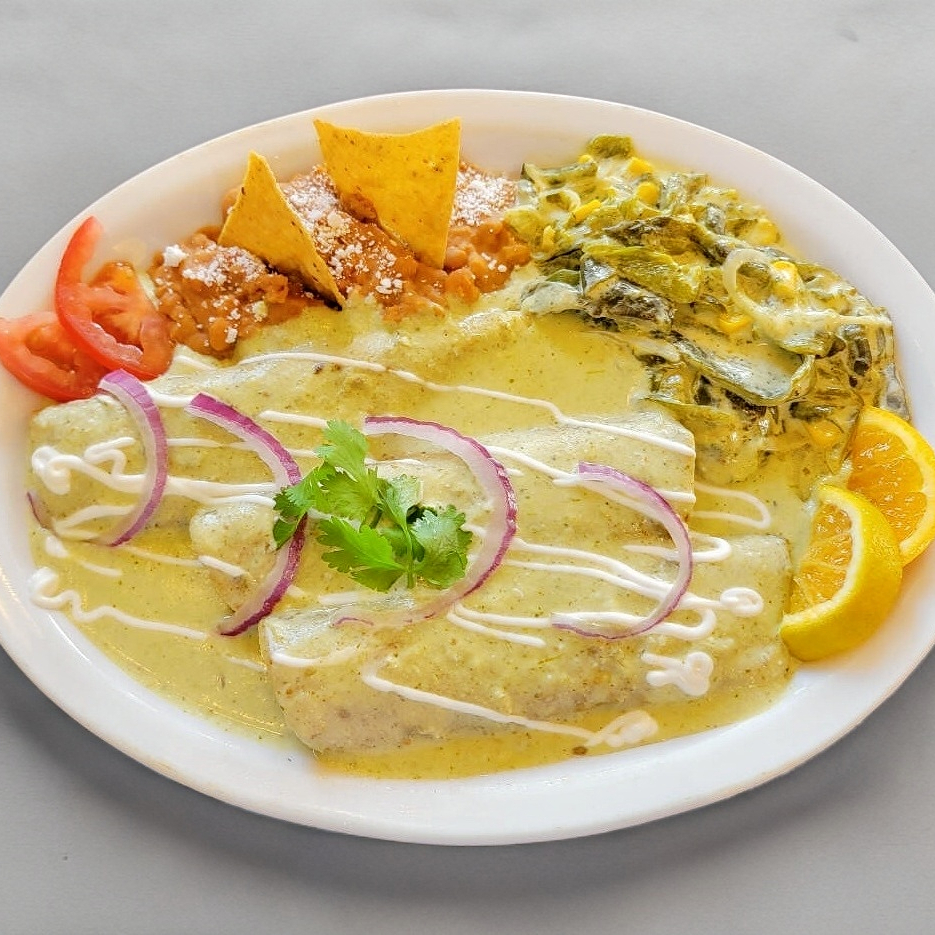 Enchiladas de pollo bañadas en salsa verde, acompañadas de frijoles refritos y rajas de chile.