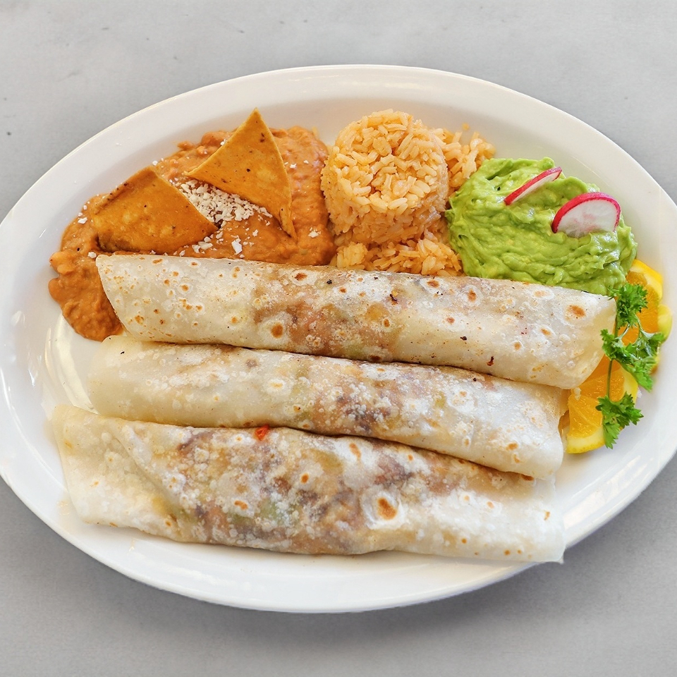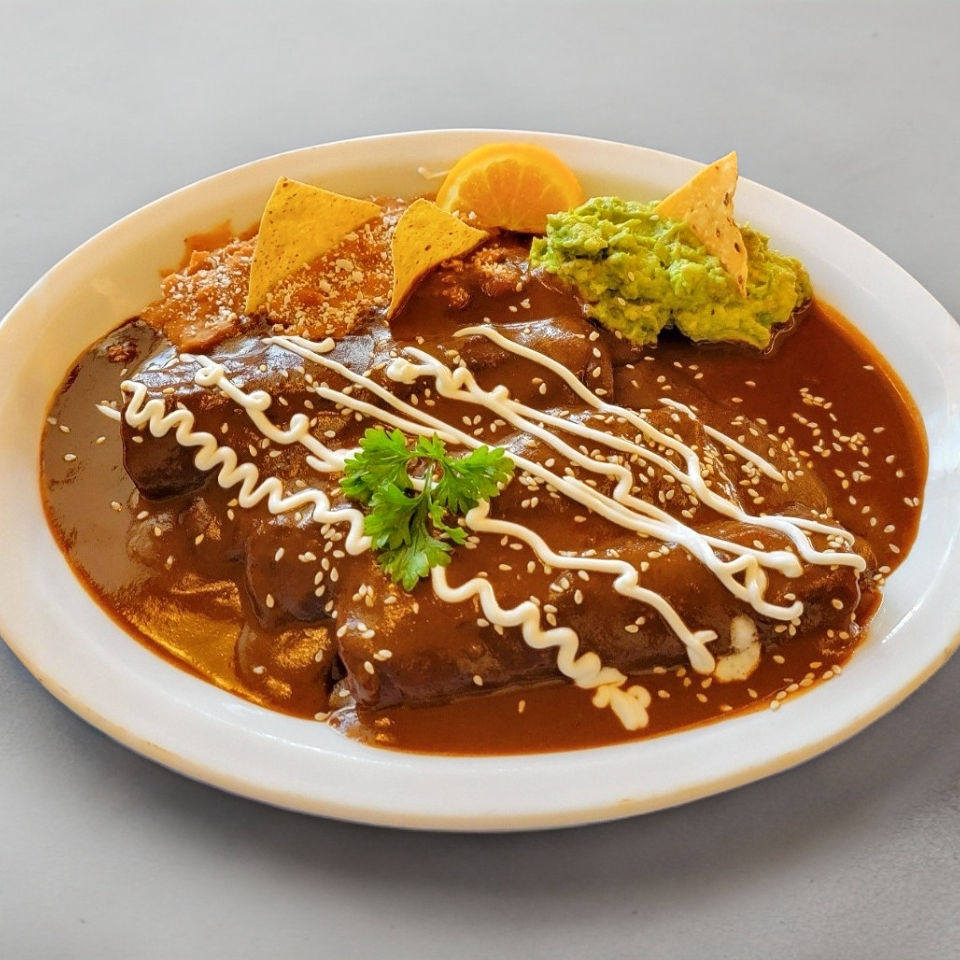 Enchiladas de pollo bañadas en salsa de mole. Acompañadas de frijol y guacamole