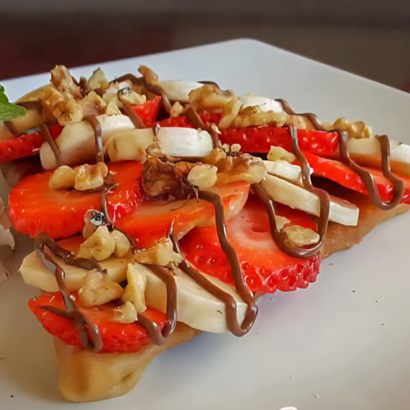 CREPA CON FRESA BANANA EN LA PARTE SUPERIOR Y NUTELLA. POR DENTRO RELLENA DE QUESO FHILADELPHIA..