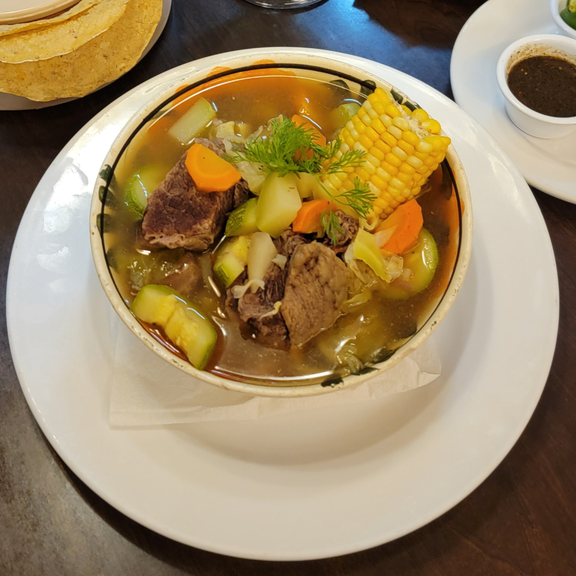 Barbacoa de res, acompañada de guacamole, frijol y arroz. Incluye tortillas de harina o maiz recien echas.