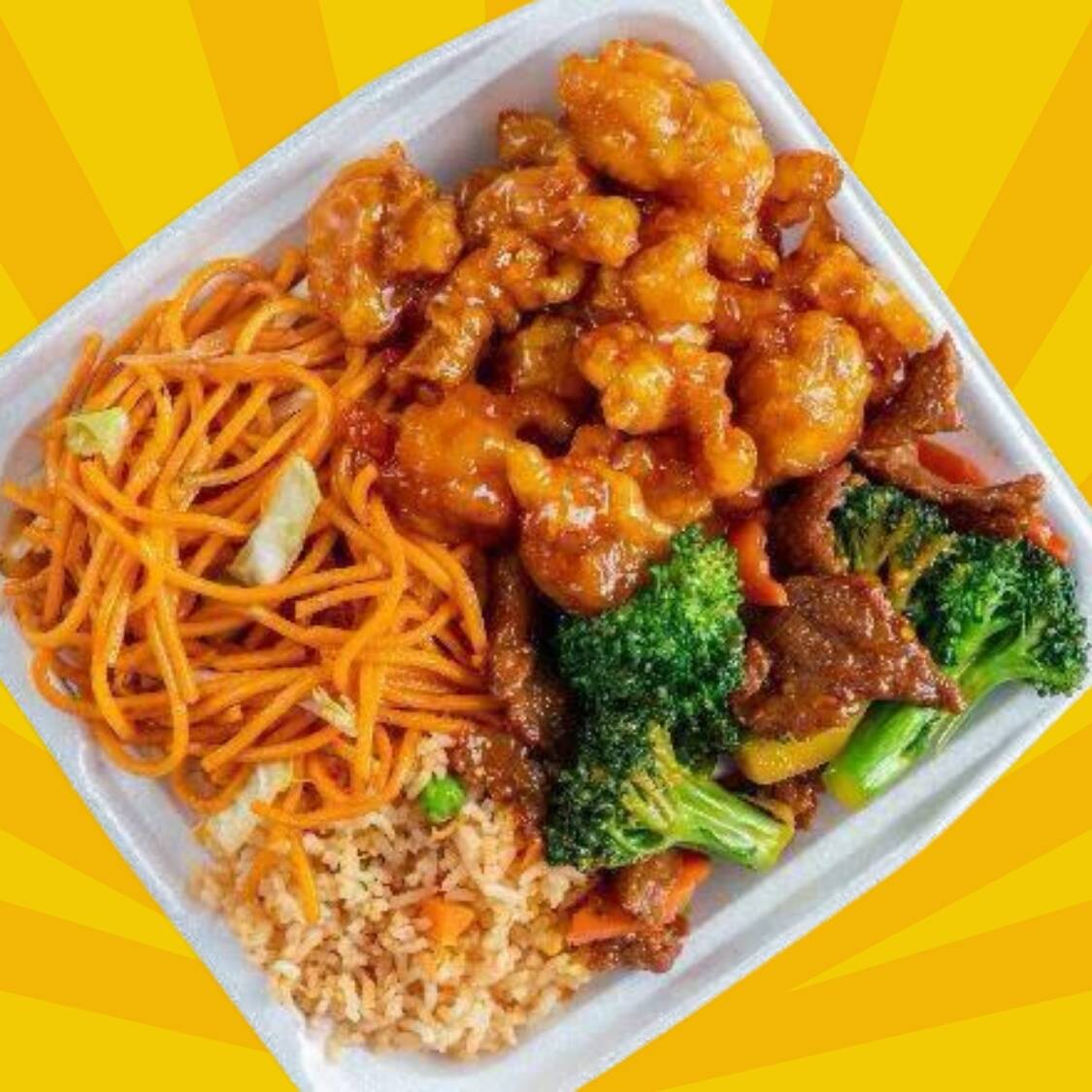 Plato personal con base de arroz blanco o frito cubierto con pollo, res y camarones en salsa Teriyaki.
