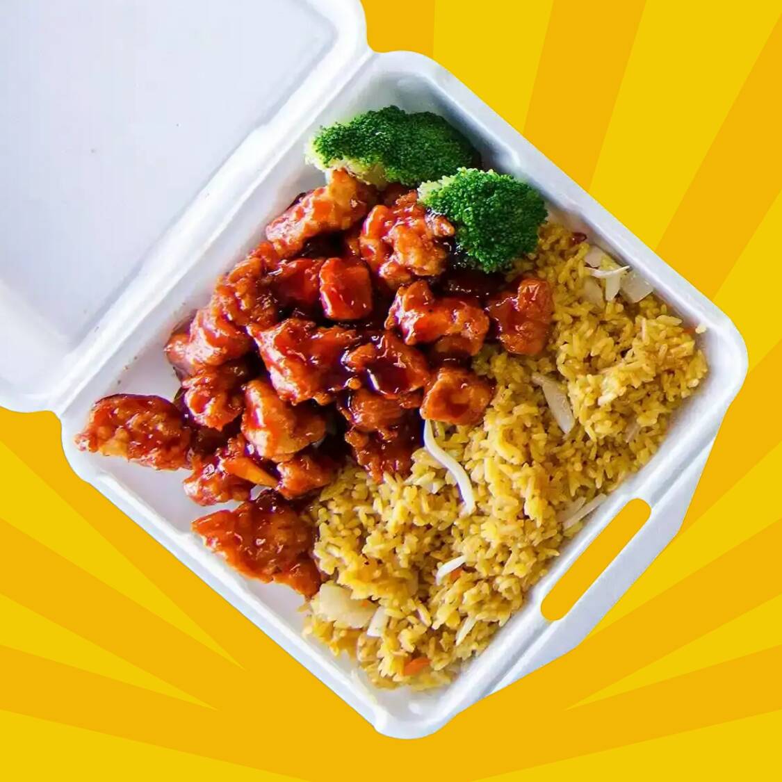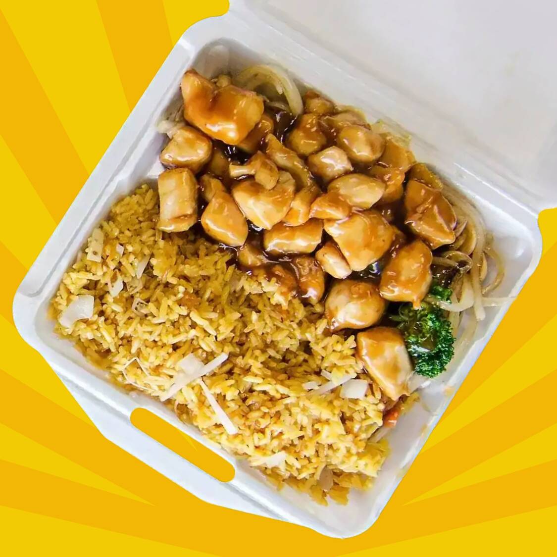 Charola de pollo bañado con salsa de teriyaki con cama de arroz blanco o frito.