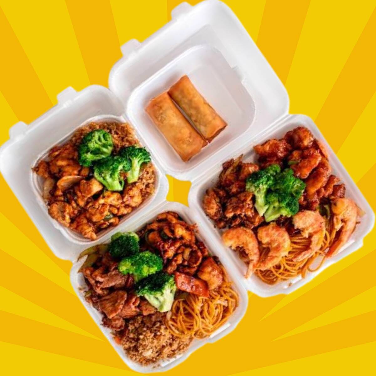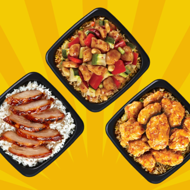 Charola de pollo, res y camarón bañado con salsa de teriyaki con cama de arroz blanco o frito.