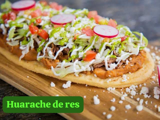 Huarache de Bisteck con frijol, lechuga, crema, queso fresco y salsa de tomatillo,