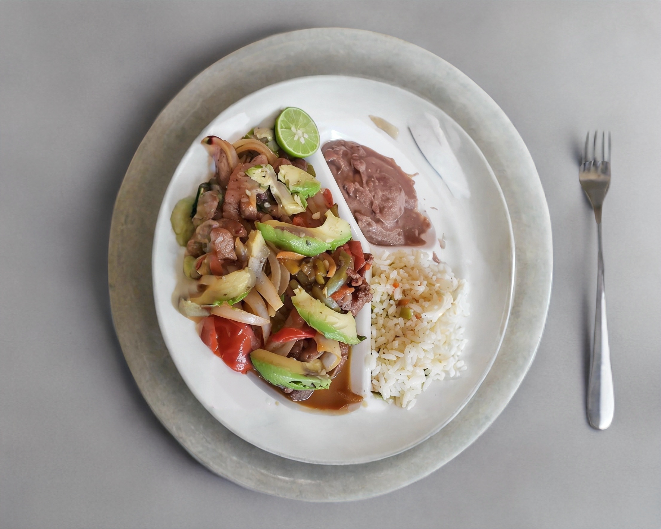 Arrachera con papas, guacamole, cebolla cambray y chiles gueritos acompañada de arroz y frijol