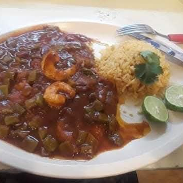 Tortitas de camarón con nopales en salsa roja acompañadas de arroz rojo