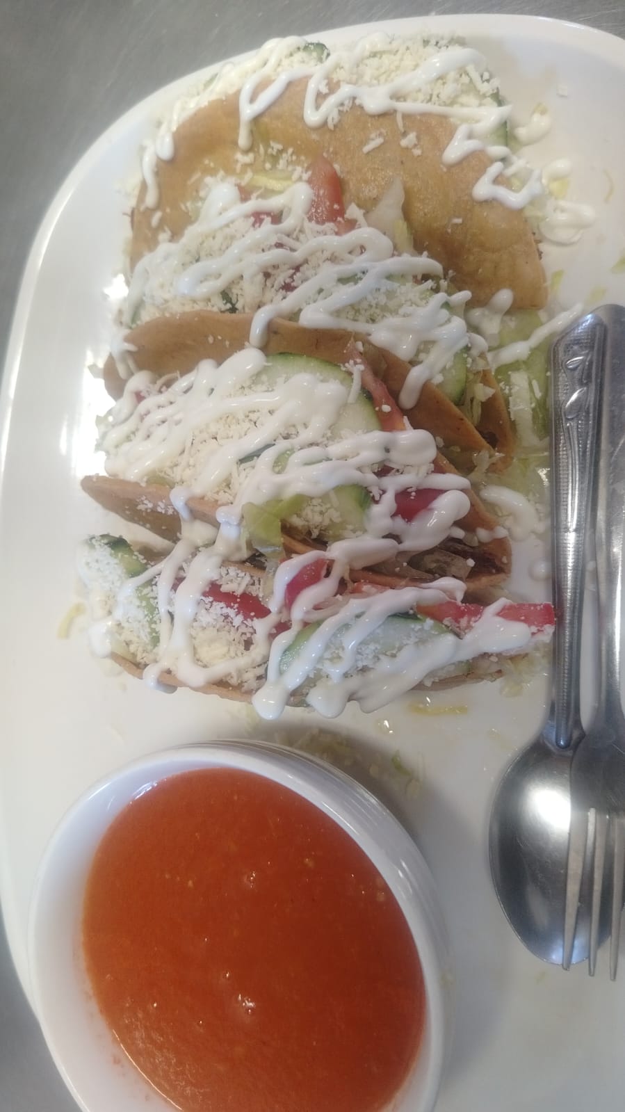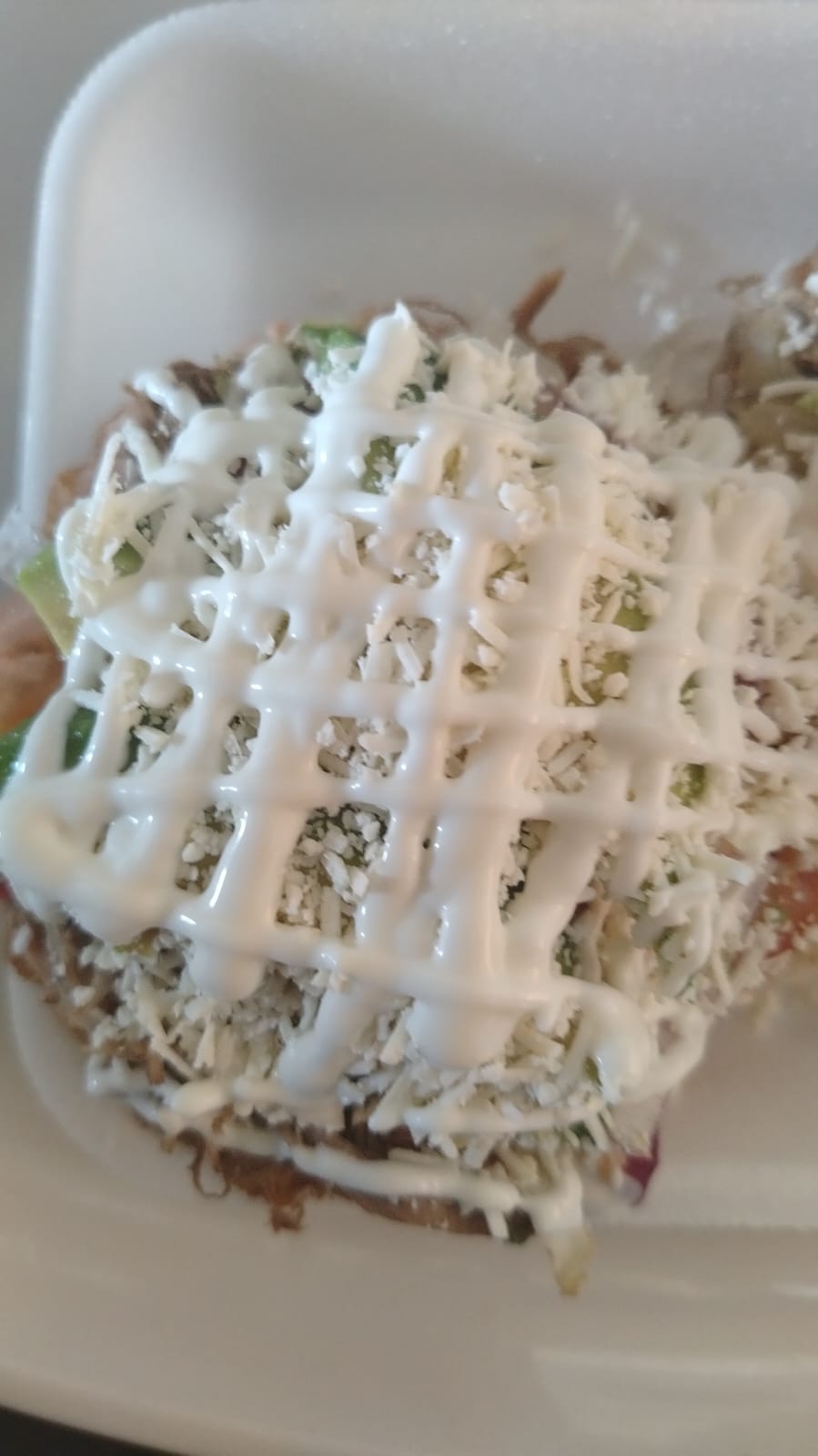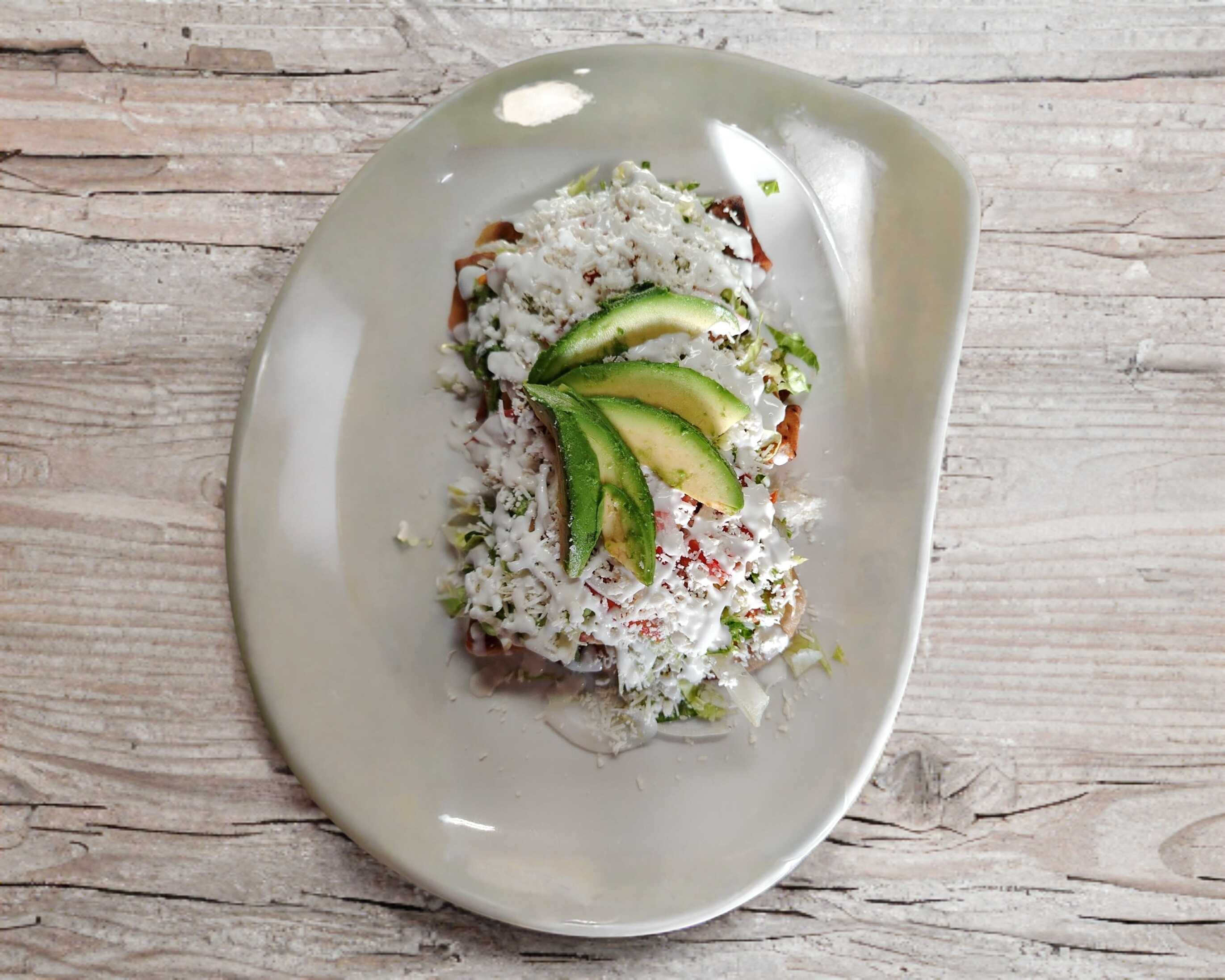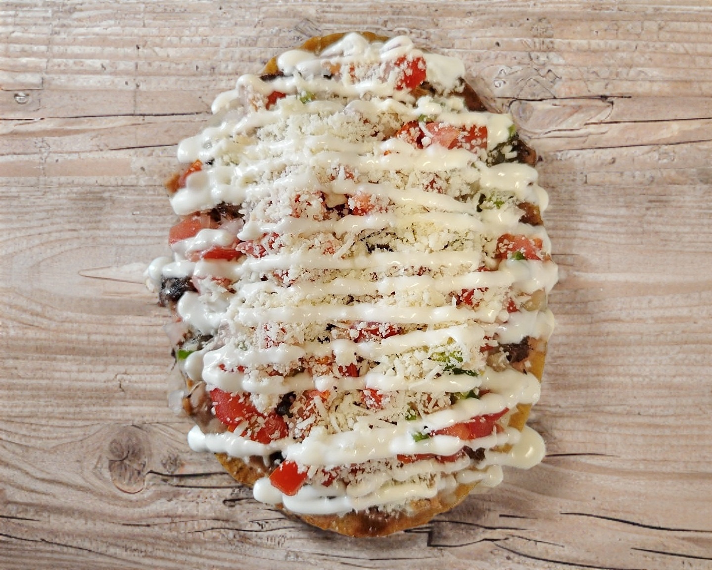 Base gruesa de maíz frita, con frijoles, lechuga, crema, queso y carne deshebrada.