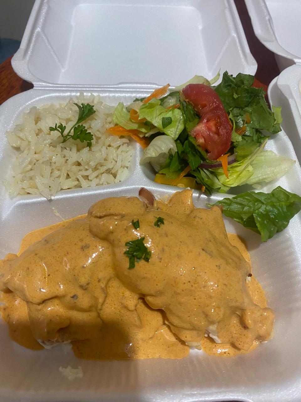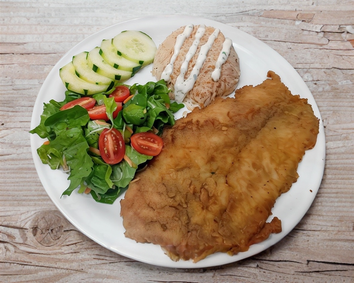 Acompañada de papas fritas, sopa fría, frijol y salsa bandera.