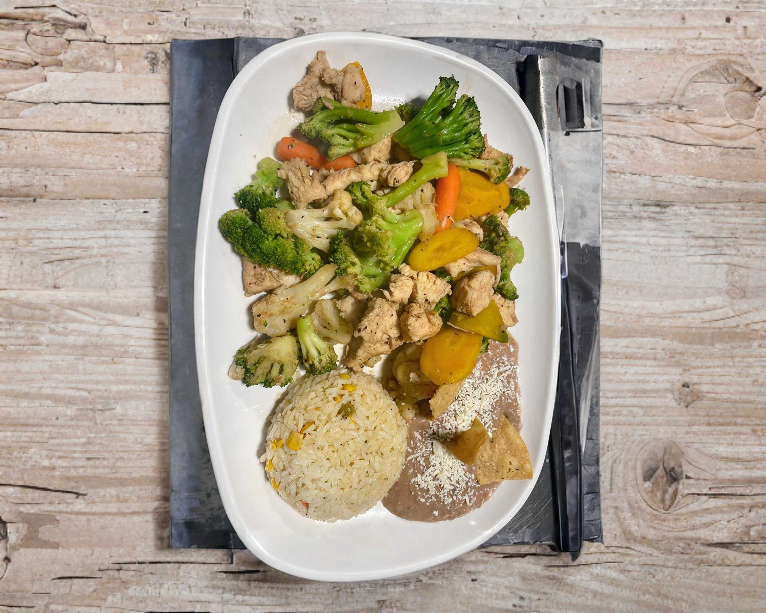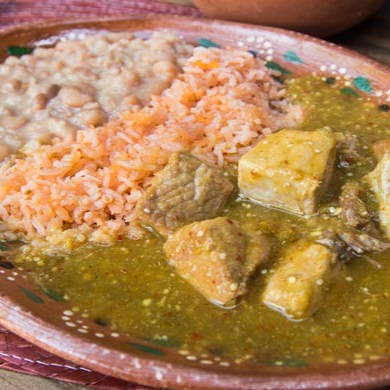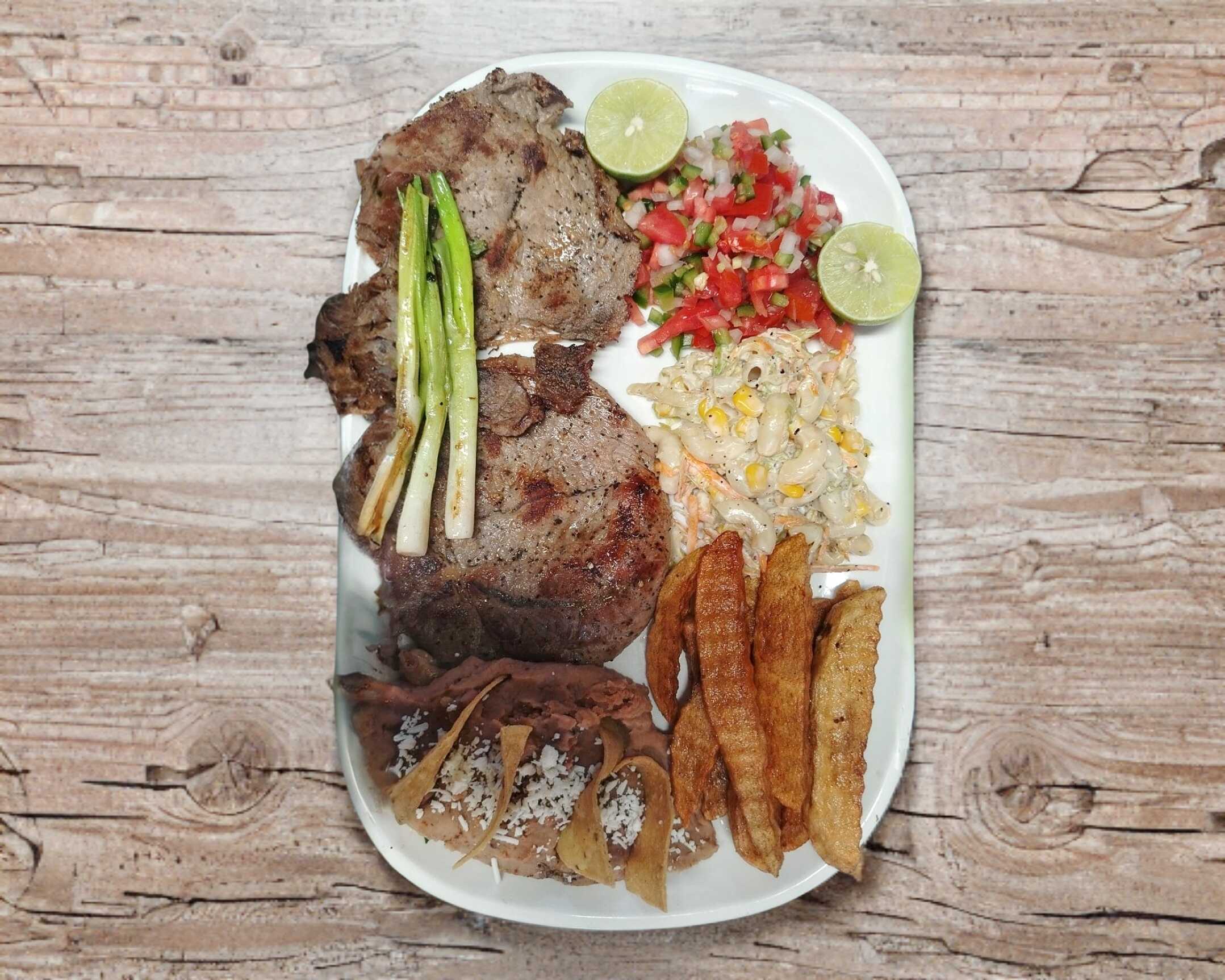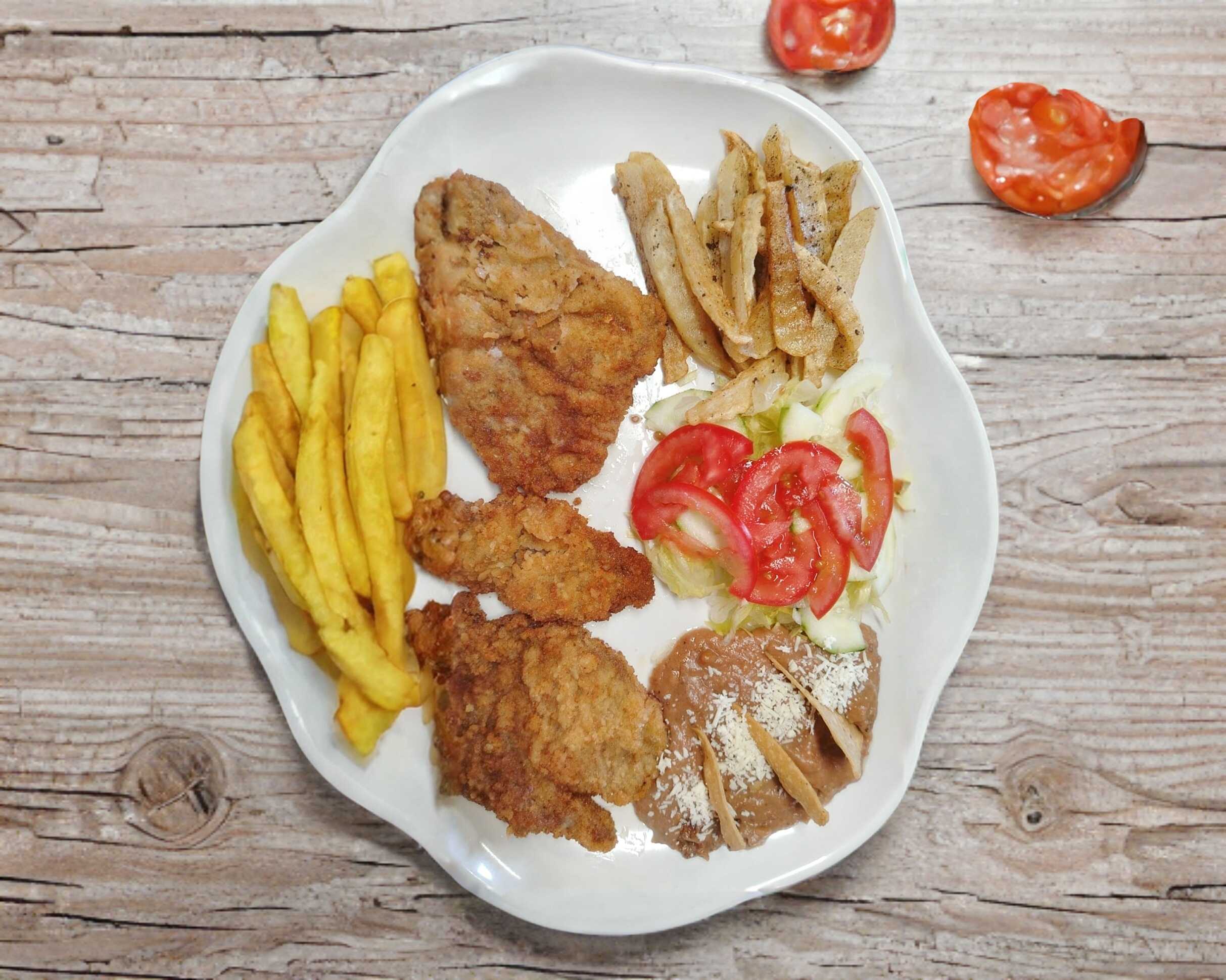 A elegir, acompañado de papas fritas, frijol y tortillas de harina o maíz.