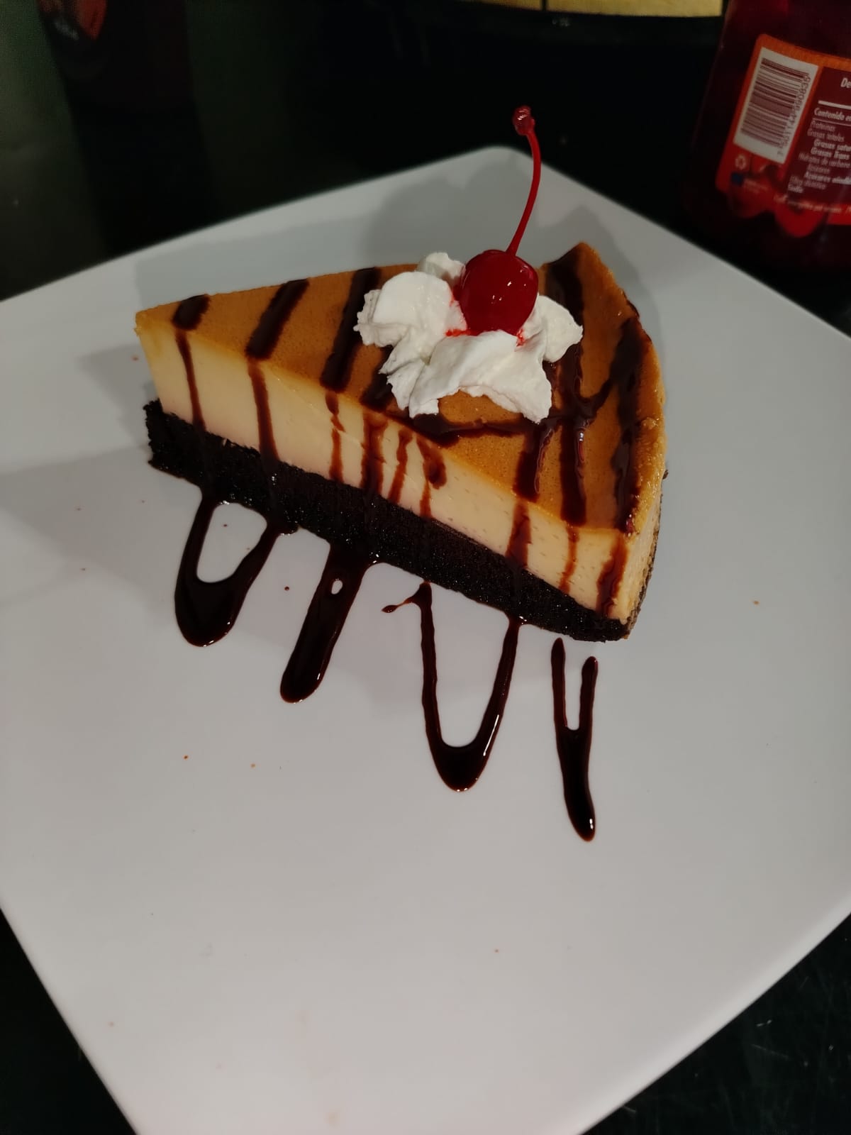 Delicioso pastel de chocolate con capa superior de flan, también conocido como “pastel imposible”.
