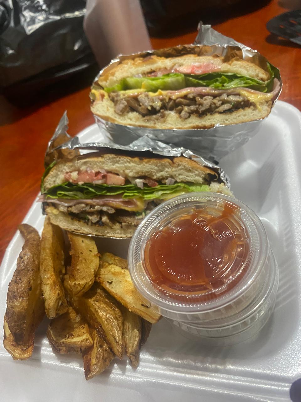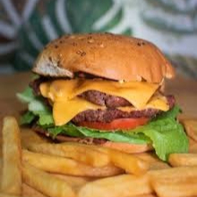 Hamburguesa con doble carne de res, acompañada de papas fritas crujientes.