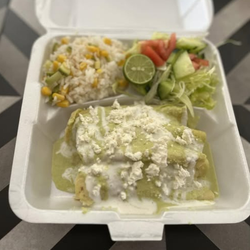 Masa de maíz rellena de carne deshebrada, con crema, queso y salsa.