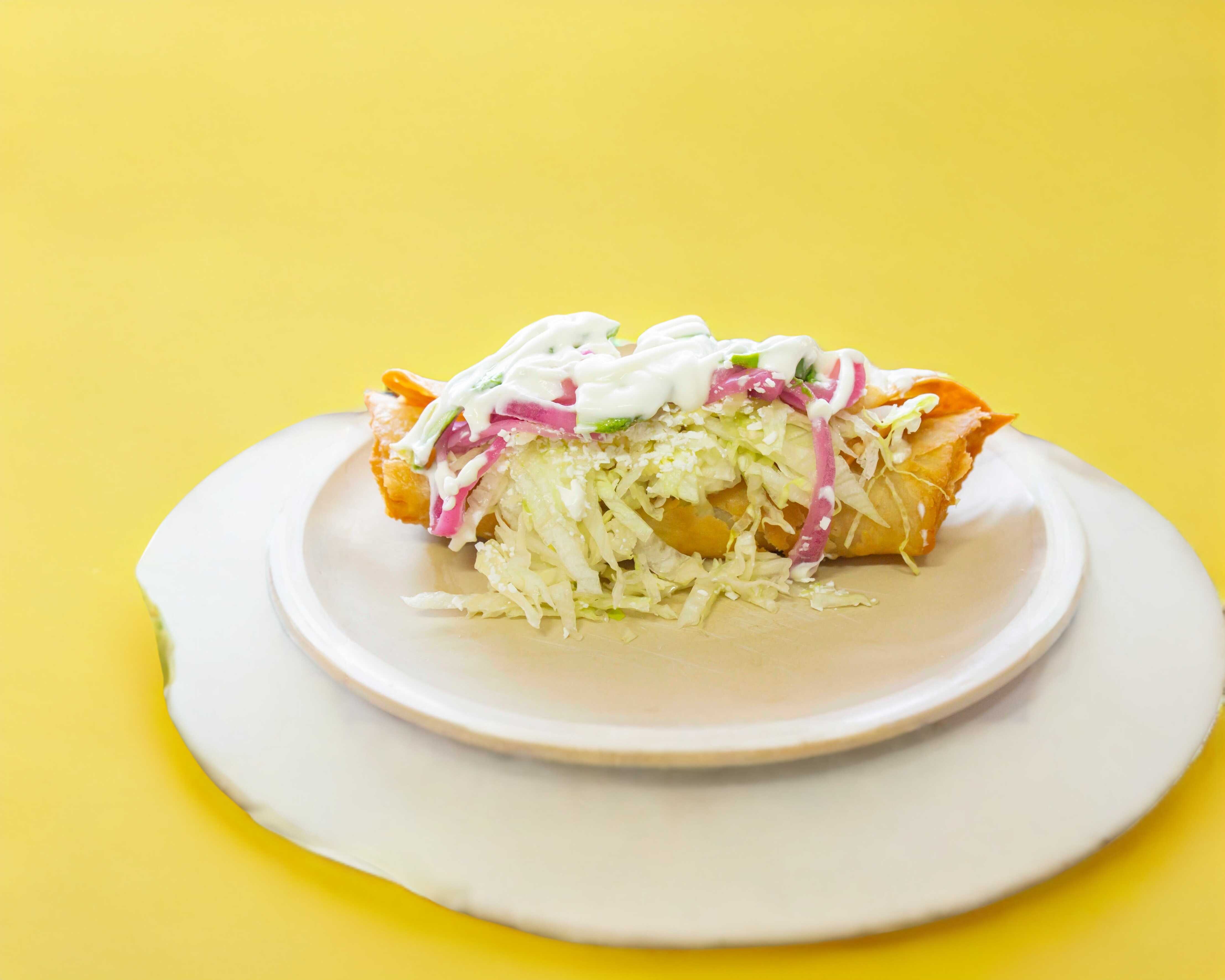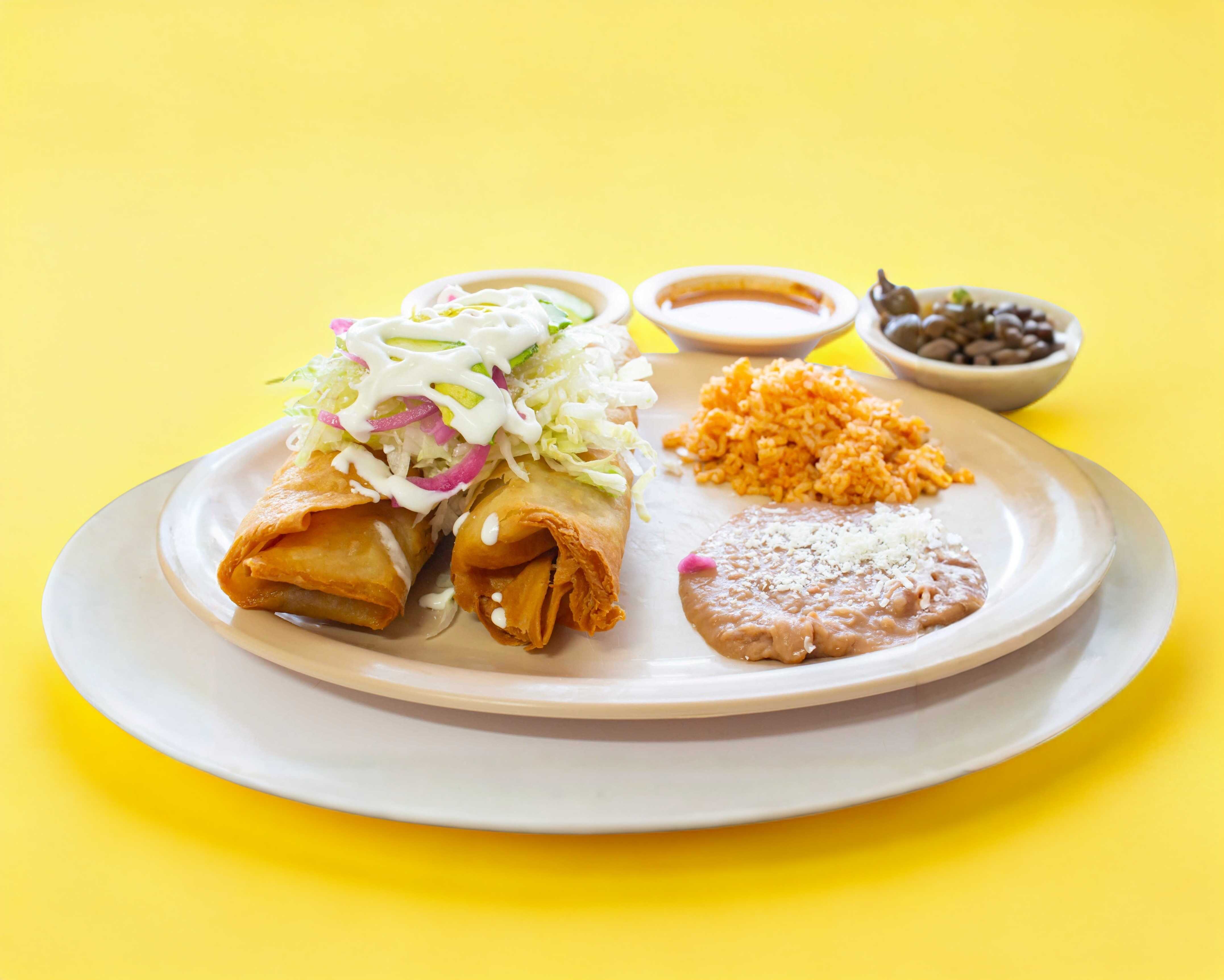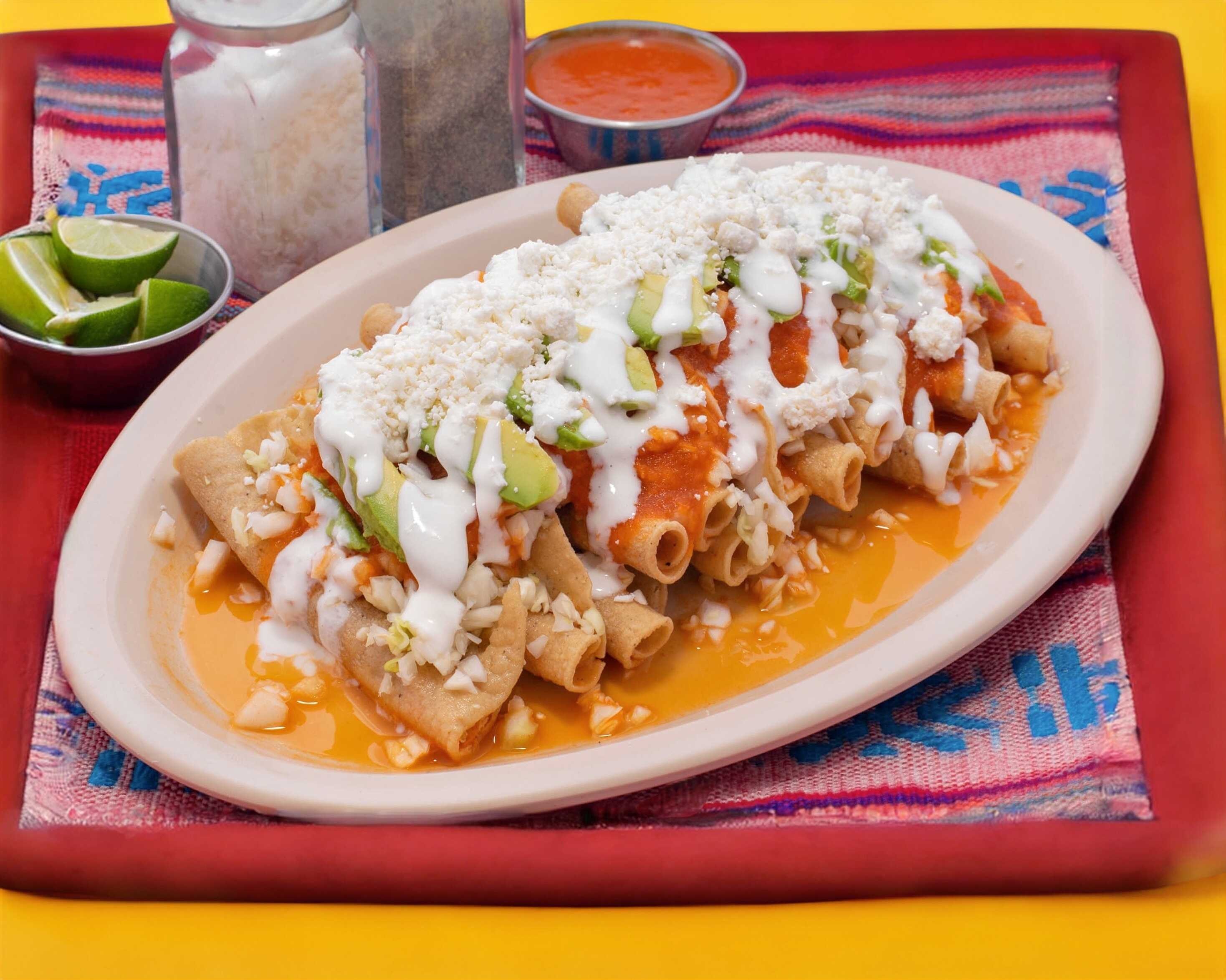 Docena de flautas de harina de maiz con Queso rayado tipo cotija y Crema, lechuga o repollo, con a sin agucate