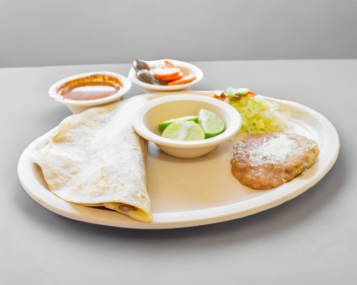 Quesadilla de tortilla de harina con carne,Acompañando de lechuga y frijol.
