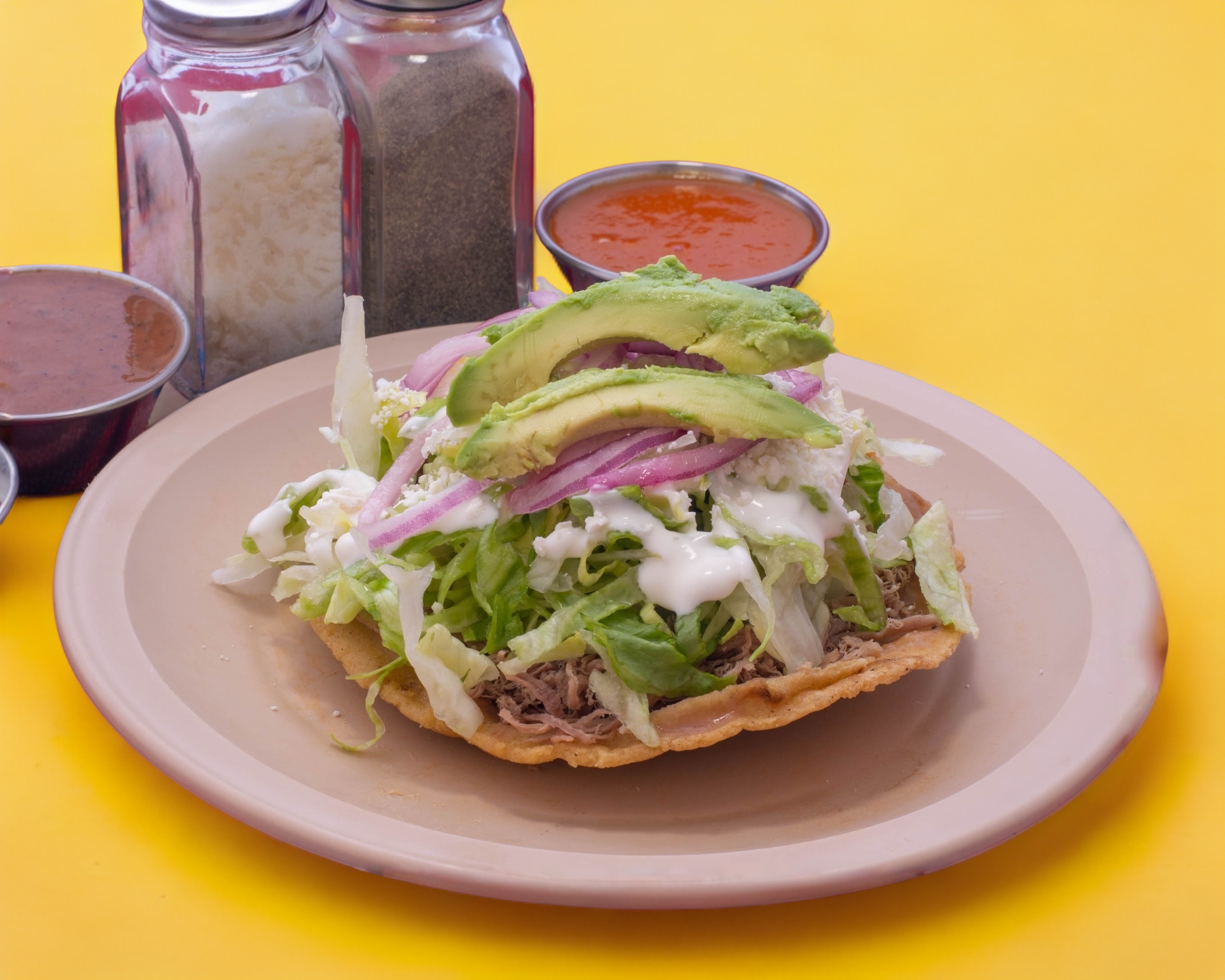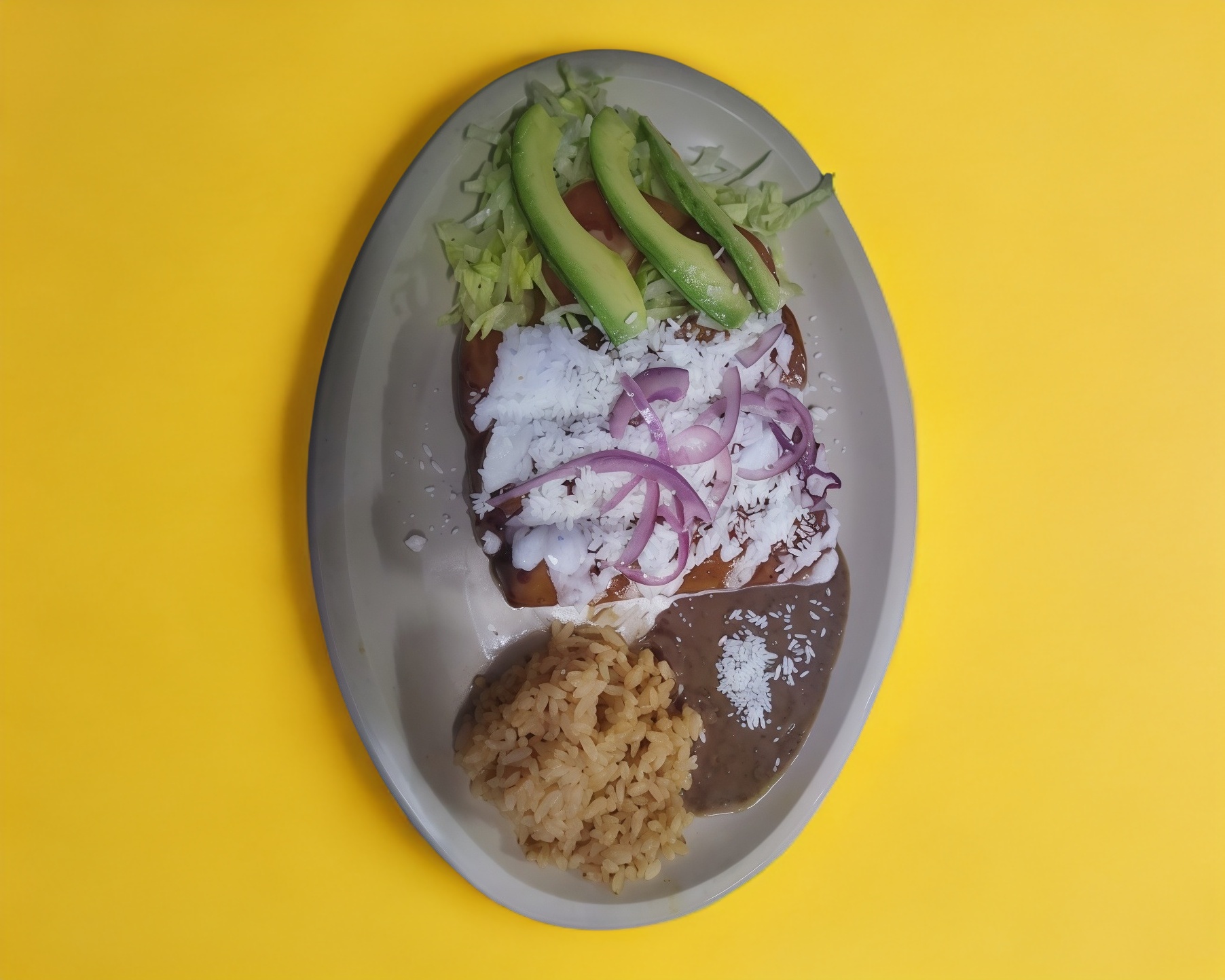 Enchiada Roja, con queso, crema, Lechuga, tomate, cebolla y aguacate.