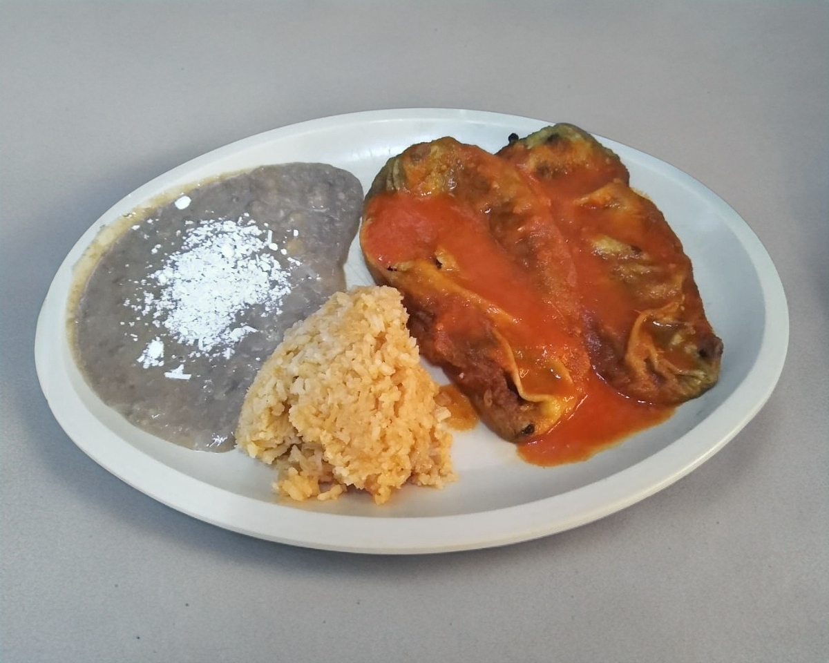 2 piezas de Chiles Rellenos ,Acompañando de arroz y frijol.