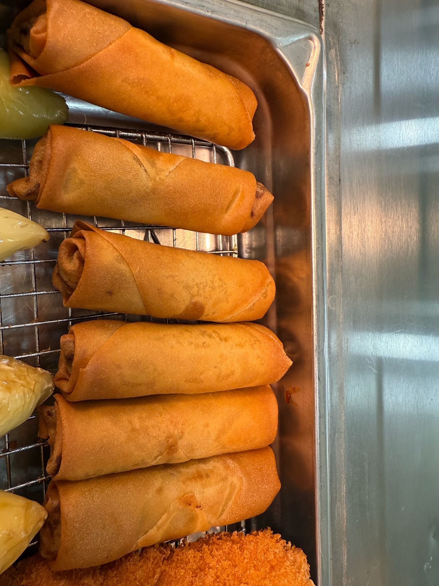 Rollito frito relleno al estilo oriental, crujiente por fuera y sabroso por dentro.