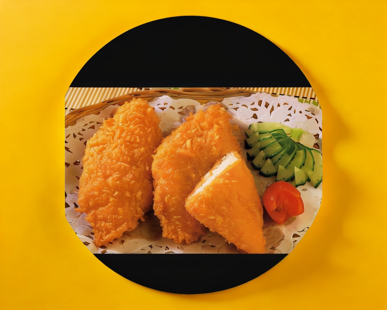 Filete de pescado cubierto con empanizado crujiente, dorado al punto perfecto.