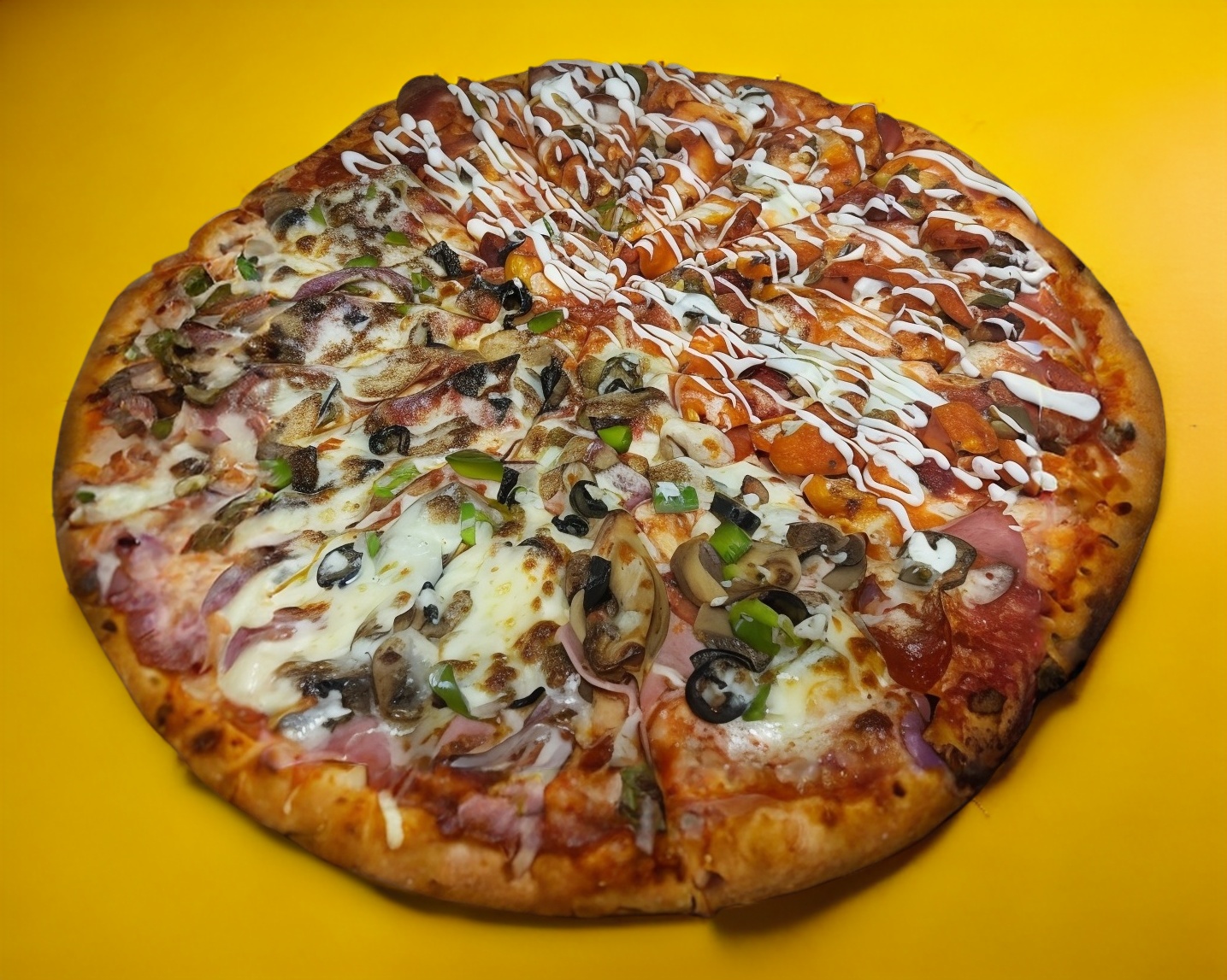 Pepperoni, jamón, salchicha italiana, morrón, cebolla, aceituna negra.