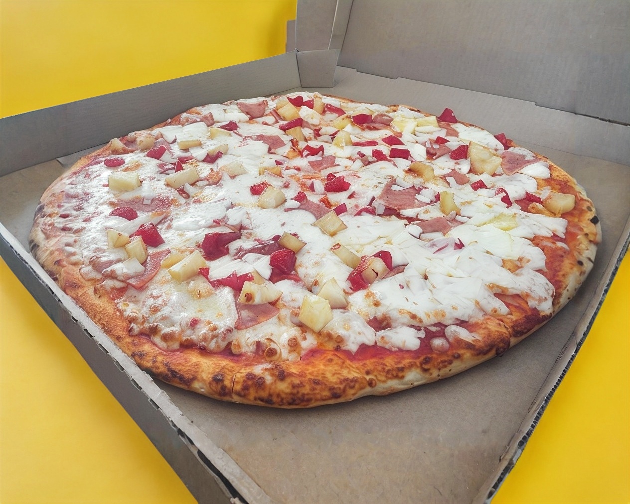 Jamón, piña, cherry, tocino y aderezo BBQ.